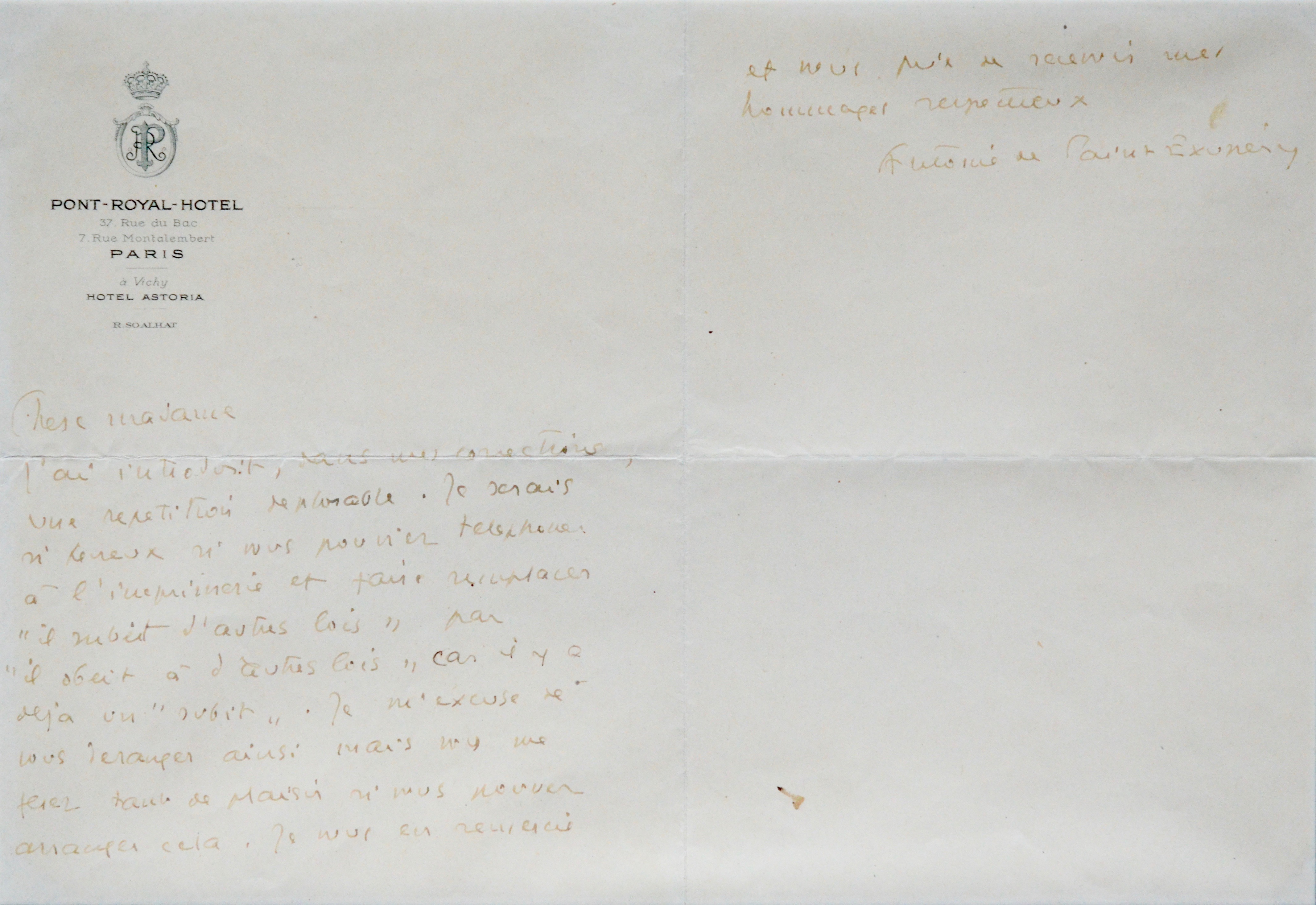 Saint-Exupéry s'adresse à une dame, probablement membre de la maison d'édition Gallimard ou de son imprimerie, au sujet d'une correction qu'il souhaite voir apporter dans un ouvrage :