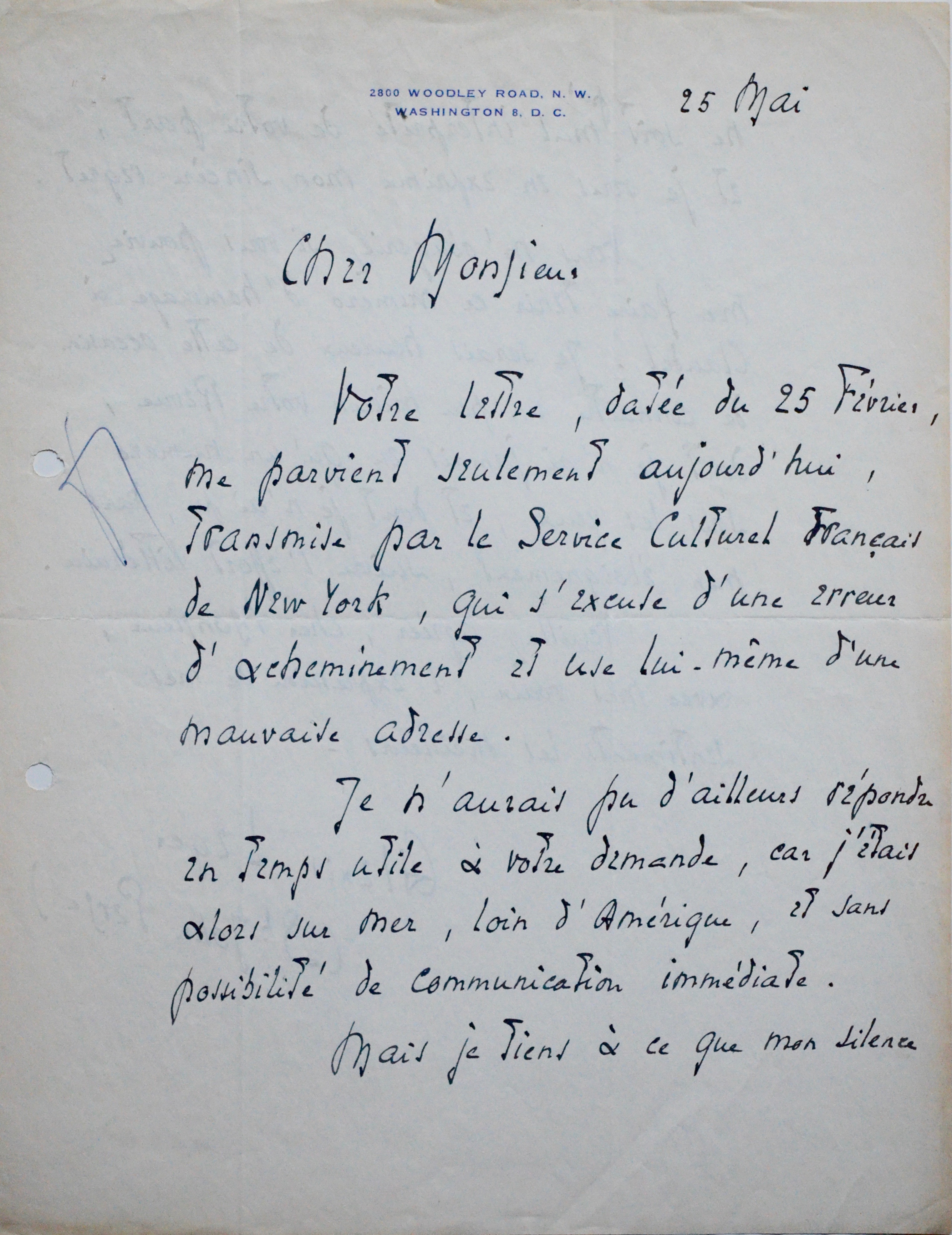 La lettre de son correspondant vient seulement de lui parvenir, retard causé par une erreur d'acheminement. Saint-John Perse était alors en mer et n'aurait, de toutes façons, pas pu répondre à son correspondant, qui le sollicitait pour un hommage à Paul Claudel dans sa revue.