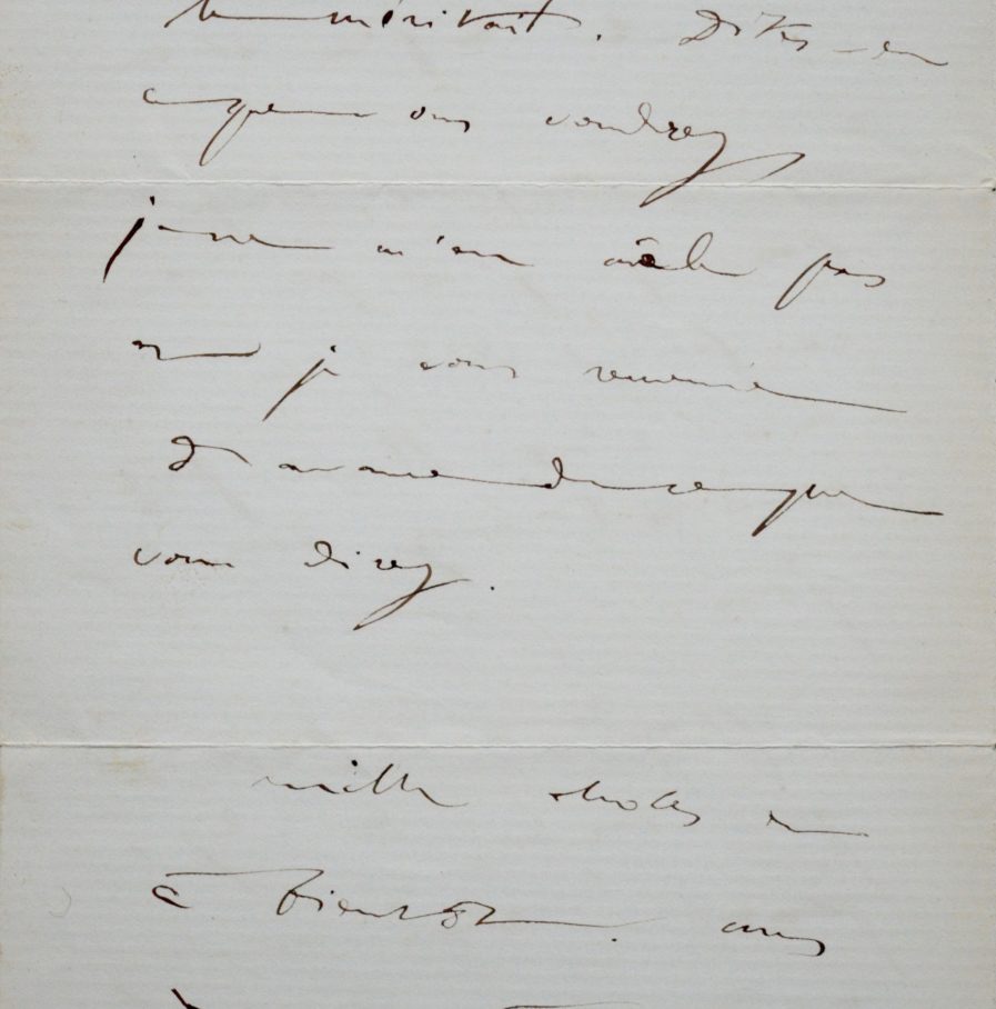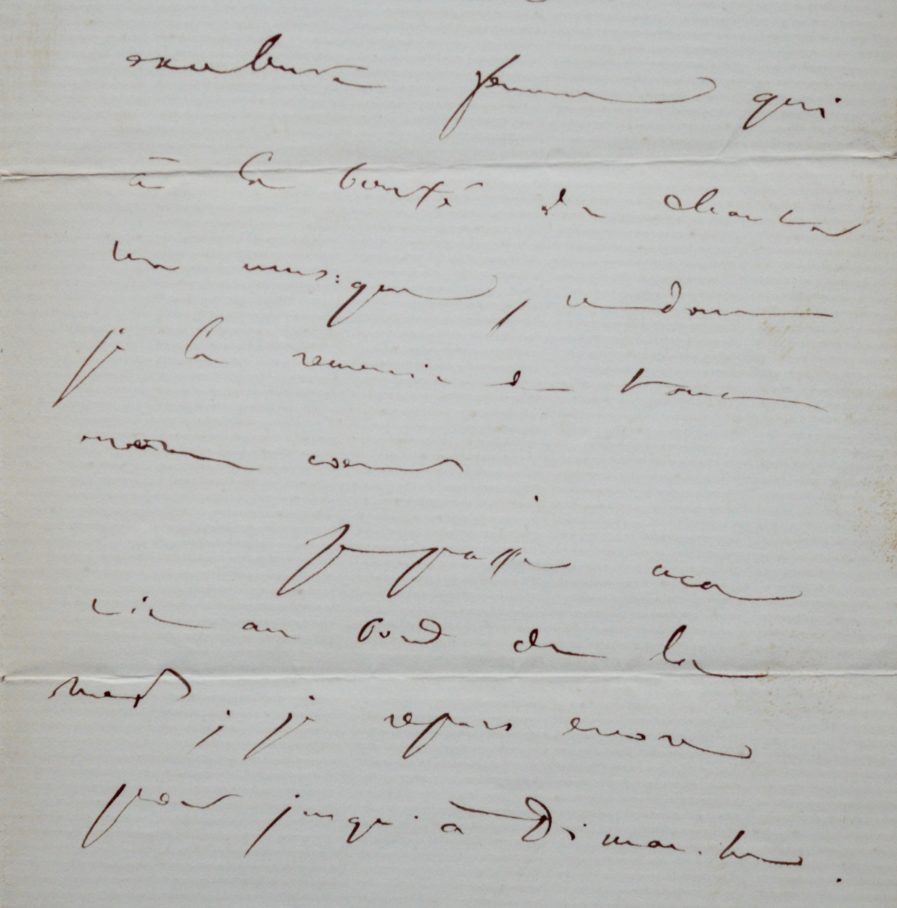 Mille choses et à bientôt. Mes respects à votre charmante femme qui à [sic] la bonté de chanter ma musique, ce dont je le remercie de tout mon coeur. Je passe ma vie au bord de la mer ; je repars encore jeudi jusqu'à dimanche. [...]".