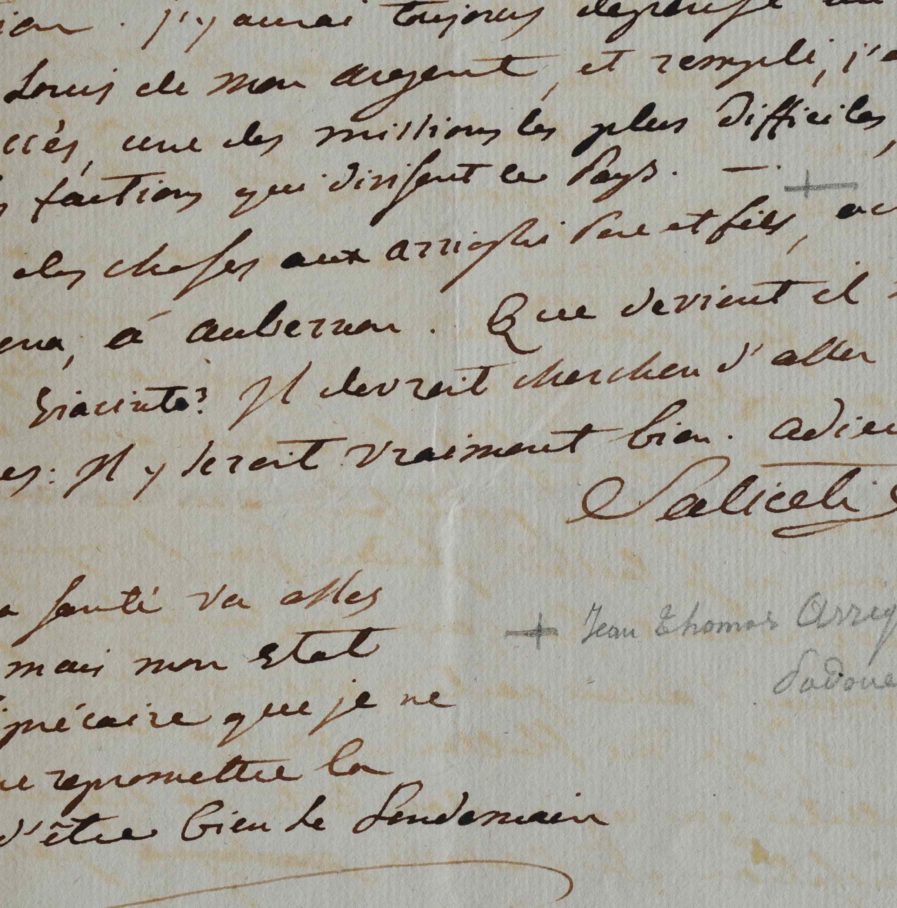 Christophe Saliceti (Saliceto, 1757/1809)Belle lettre de Saliceti sur les affaires de la famille Bonaparte et son action en Italie. "Quoique tu ne m'aies pas dit, mon cher Arighi, si tu as fait remettre à Joseph la lettre que je t'ai adressé le 23 du mois dernier, je présume que tu n'y auras pas manqué. Elle était relative à l'acquisition d'un bien que la famille Cambioso possède dans les environs de Morfontaine, et que Joseph voudrait faire. Je n'ai pas encore reçu de réponse. Mrs Cambioso voudraient savoir à quoi s'en tenir. Je te prie de sonder un peu indirectement Mad. Bonaparte la mère, ou bien l'archevêque de Lyon [le cardinal Fesch] pour savoir s'ils connaissent à cet égard la détermination de Joseph, sans pourtant leur dire que je t'ai écrit pour cet objet. Fais remettre la lettre ci-jointe à mad. Debré. Elle en contient une pour Caroline. Il est temps qu'elle commence à prendre du goût pour l'ordre, ainsi il ne faut pas que tu lui donnes de l'argent [...]. A l'heure qu'il est je pense que Féréri aura été reçu par le 1er Consul en sa qualité de ministre de la Ligurie. C'est un homme de bien, qui faira son devoir, sans se mêle d'aucune intrigue. Je m'attendais bien au mécontentement de ses prédécesseurs. J'ignore s'ils sont fondés à se plaindre du ministre Talleyrand. Quant à moi je sais que j'en ai fait pour eux plus qu'ils ne méritaient [...]. Dans tous les cas, je ne crains les murmures d'aucun parti, je ne me suis livré à aucun, et j'ose me flatter que ma conduite, la tranquillité qui règne dans toute la république, l'organisation qui s'achève paisiblement malgré les entraves de tout genre que l'on a cherché d'y mettre, répondent d'avance à tout ce qu'on pourrait dire sur mon compte. Dans le courant de cet hiver, ma besogne sera terminée, et j'espère que le 1er Consul ne me laissera pas ici. Dans tous les cas, qu'on me place ailleurs ou non, au printemps, je quitterai Gènes et la légation [...]». Il adresse son amitié aux Arrighi père et fils [Hyacinthe Arrighi de Casanova (1748/1819), député corse et cousin de Mme mère ; et son fils Jean-Thomas (1778/1853), général d'Empire], ainsi qu'à Massena, et évoque sa santé précaire.