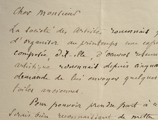 «La Société des artistes rouennais qui a l'intention d'organiser au printemps une exposition de peinture composée, dit-elle, d'oeuvres résumant le mouvement artistique depuis cinquante ans, me demande de lui envoyer quelques unes de mes toiles anciennes». Aussi, Samuel Frère demande-t-il à son correspondant, s'il pourrait prêter la toile qu'il lui avait achetée, vingt ans auparavant, ayant pour titre Le Village breton. Il lui indique les modalités.