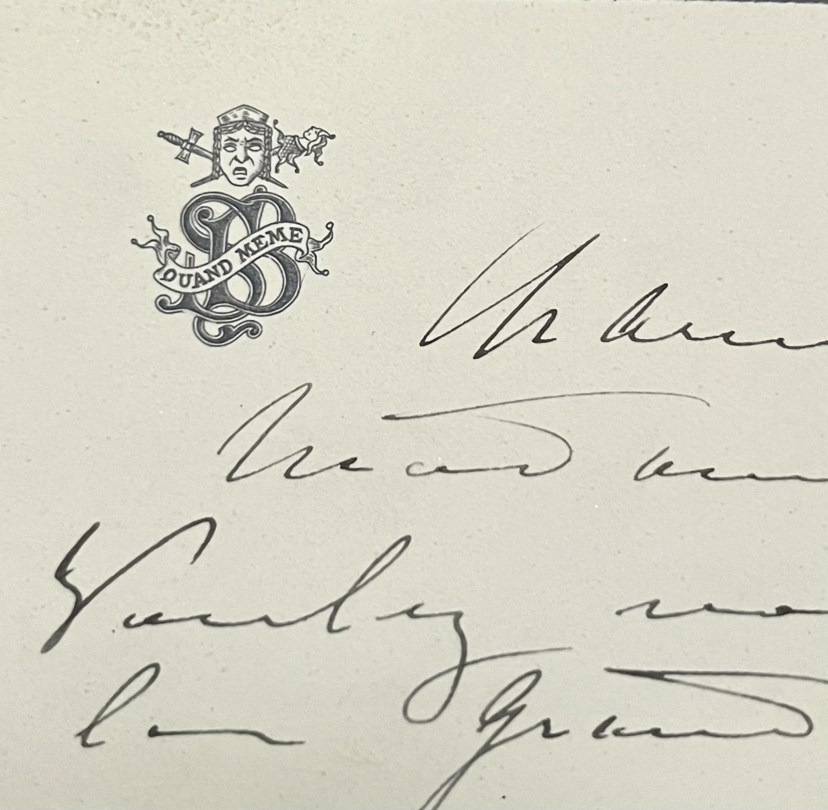 Carte double ourlée de gris avec son chiffre et sa devise "Quand même".