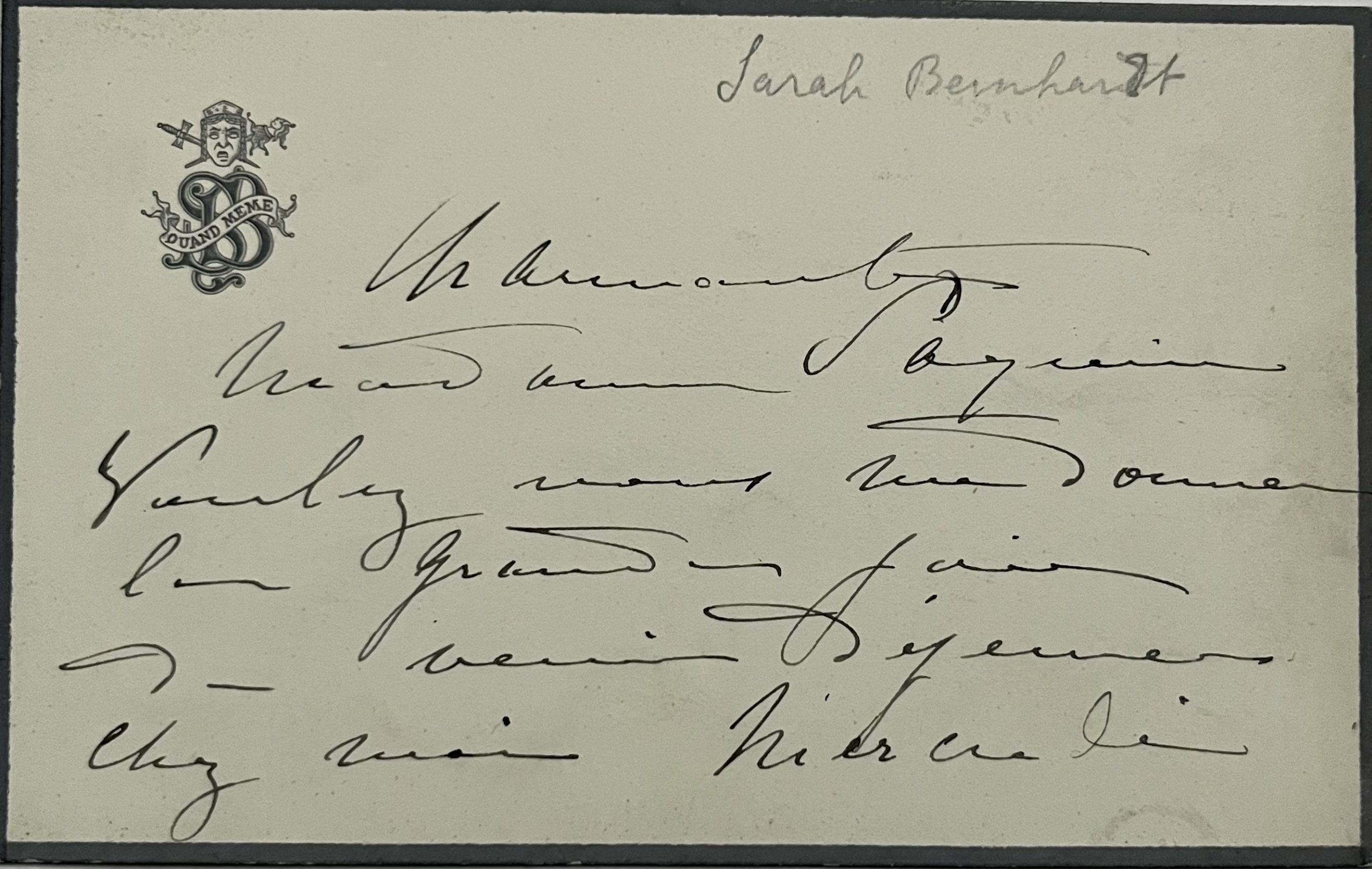 Belle carte de Sarah Bernhardt adressée à la grande couturière Jeanne Paquin.