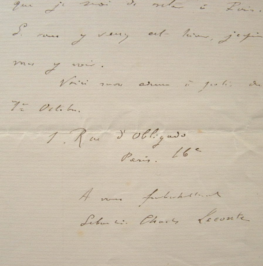 Sébastien Charles Leconte (Arras, 1860/1934)«Hélas ! non, mon cher confrère, je n'ai pas l'honneur d'être Normand. Je suis tout bonnement du Nord de la France [Arras], ce qui m'a permis de me donner en lecture (?) poétique de nos aïeux germaniques. J'ai eu le tort, n'y ayant sans doute aucun droit, de leur donner aussi une tournure de Vikings [...]. Mais nous n'en avons pas moins des affinités. Comme vous, j'ai peu de sympathie pour l'esprit latin et celto-latin. J'aime les vers comme les vôtres, qui semblent renvoyer l'éclat des choses [...]. J'aime la pourpre barbare et le métal farouche de vos strophes [...]». Il lui adresse son dernier recueil et parle, non sans humour, de la dégénérescence du peuple français. «Je partage votre dédain pour nos Franks dégénérés qui ne sont plus hélas ! que des Celtes ou des Ligures [...]. Mais nous ne sommes plus assez nombreux, et il n'y a rien à faire. L'Ostrasie a été perdue par ce crétin de Charlemagne, et la Neustrie est maintenant dans un affre d'éléments ignobles venus du plateau central et de la Langue d'Oc. Vive Simon de Montfort !».