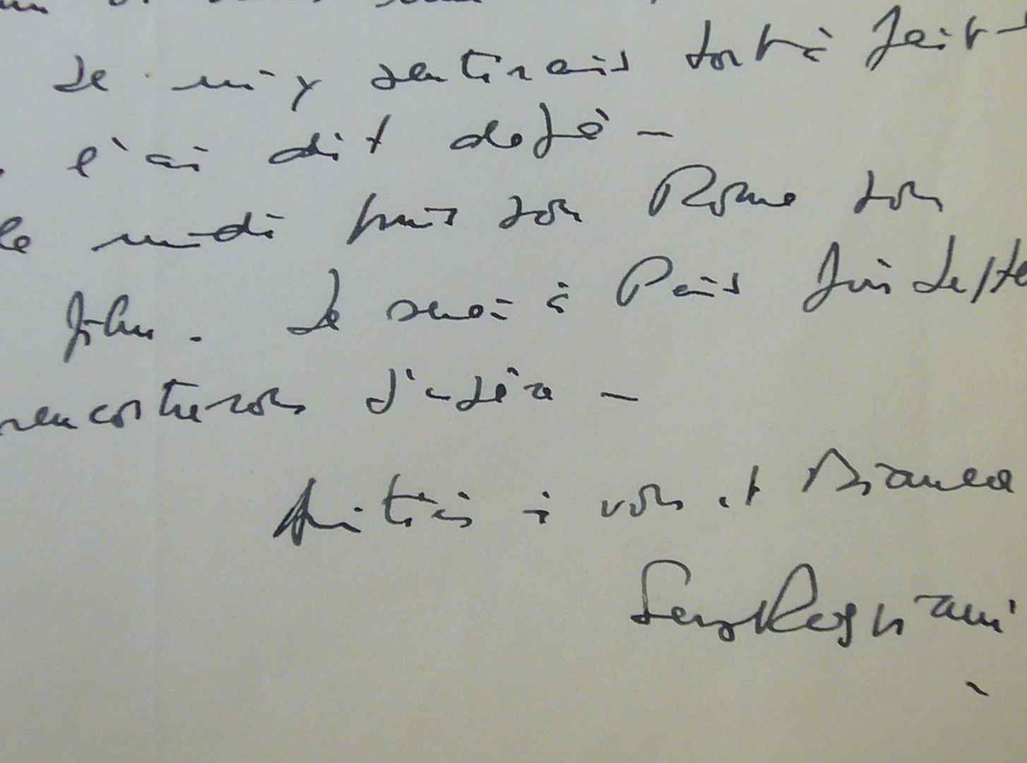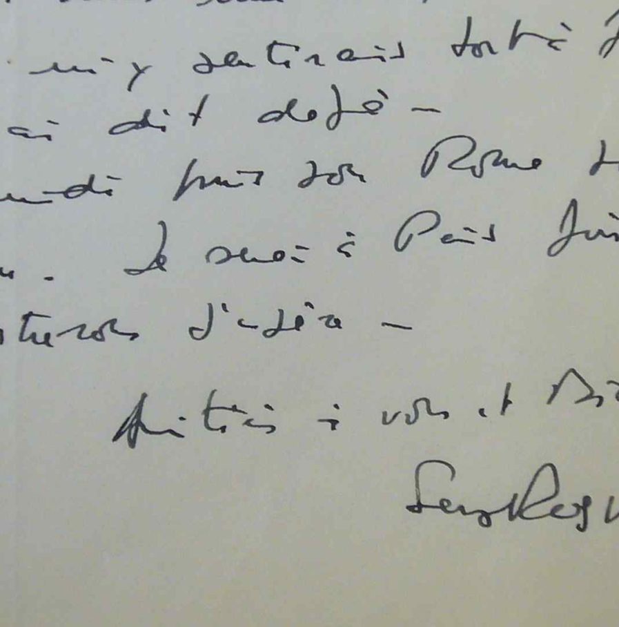 Serge Reggiani (Reggio d'Émilie, 1922/2004)Serge Reggiani, très sollicité, répond à l'offre de Félicien Marceau de jouer dans sa pièce l'Oeuf. "Je n'ai pu lire l'Oeuf que ces jours-ci et il a fallu que je prenne une décision quant à une pièce de T. Williams que J. Dassin doit monter et l'Amphitryon 38 de Giraudoux". Il préfère décliner sa proposition de jouer l'Oeuf au théâtre et s'en explique : "Je trouve la transposition de "Chair et cuir" très attachante mais j'ai très peur de sa réalisation qui devrait être large dans le sens presque lyrique. C'est très difficile - et je me vois assez mal dans le personnage tel qu'il est là - alors que dans le bouquin ou dans une adaptation cinématographique plus naturelle, je m'y sentirais tout à fait bien comme je vous l'ai dit déjà. Je pars pour le Midi pour Rome pour 3 mois 1/2. Un film. Je serai à Paris fin septembre et nous nous rencontrerons j'espère". [C'est Jacques Duby qui jouera le rôle, dans une mise en scène d'André Barsacq, au théâtre de l'Atelier ; la pièce est créée le 27 décembre 1956. Elle connaît un succès mondial et est joué pendant plus de trois ans].
