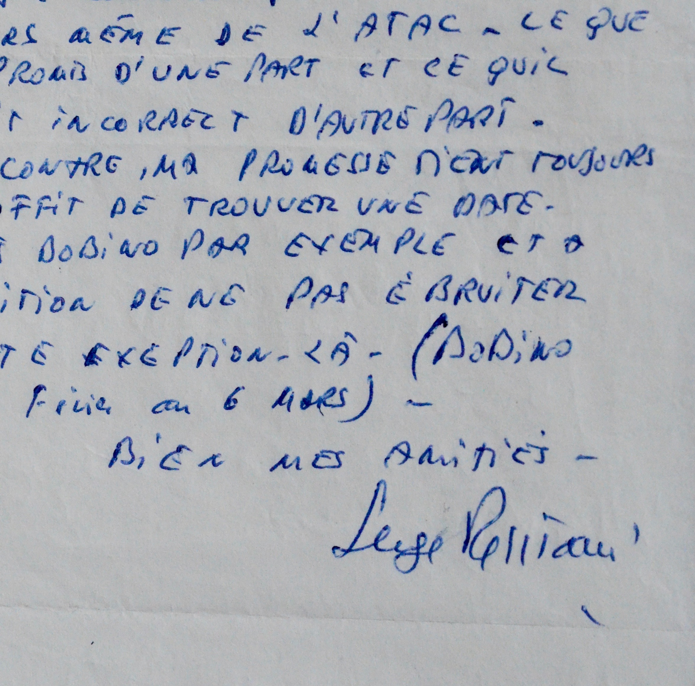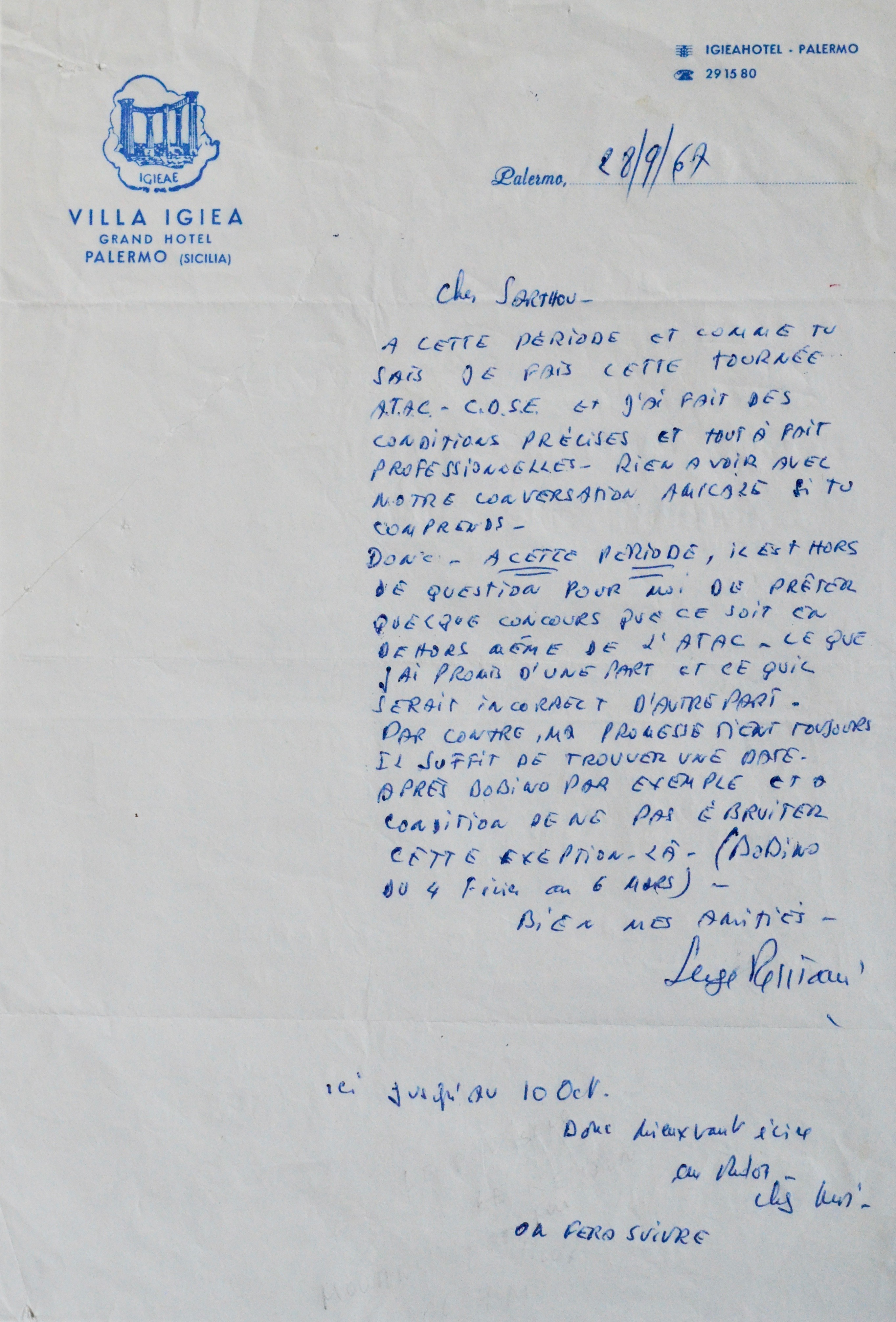 Donc - à cette période, il est hors de question pour moi de prêter quelque concours que ce soit en dehors même de l’ATAC […]. Par contre, ma promesse tient toujours. Il suffit de trouver un date - après Bobino par exemple et à condition de ne pas ébruiter cette exception là (Bobino du 4 février au 6 mars" […]".
