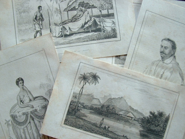 Série de 11 gravures sur acier, d'après les dessins de Danvin, extraites de l'ouvrage de Domeny de Rienzy, Océanie ou cinquième partie du monde, publié chez Didot, en 1836-1837. Corps conservé après sa mort, Jeune fille portant des présens, Vue d'un intérieur de Matavaï, Village de Rateïa, Pomaré II, Tombeau de Pomaré II, Moraï ou tombeau de Paparé, Vue de l'île Huahiné, Alembic tambour et trompette ou conque marine, Vue du nord-est du district de Fari à Houahine, Ustenciles divers.