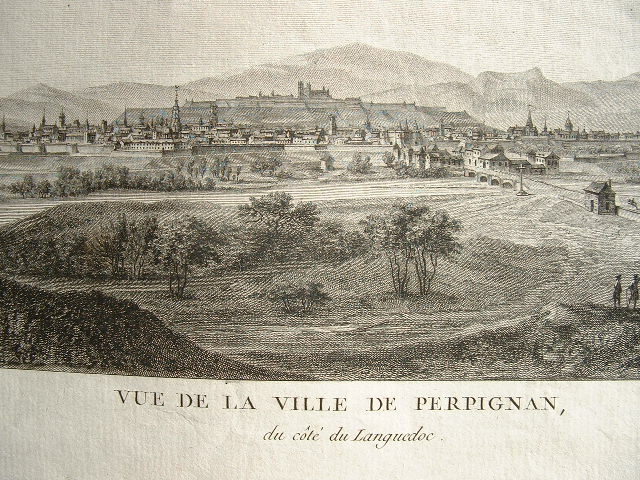 Bel ensemble de 8 vues animées de Perpignan (sur 5 feuilles), gravées par François Denis Née (1732/1817), d'après les dessins du chevalier Louis Nicolas de Lespinasse (1734/1808) : "vue de la ville de Perpignan du côté du Languedoc", "vue de la ville de Perpignan du côté d'Espagne", "vue de l'école militaire de Perpignan", "vue de la façade de l'université de Perpignan", "vue du jardin des arbustes de l'université de Perpignan", "vue du jardin des plantes de l'université de Perpignan", "vue du champ de Mars de Perpignan", "vue du col de Pertus et du château de Bellegarde où se trouve le passage principal du Roussillon en Espagne".