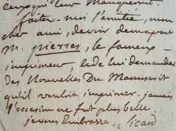 «Tous les articles étant nécessaires à l'instruction des demoiselles, je n'en peux effacer aucun. Voici ce qu'il faut faire : sans chercher de soumaitresse, vous me proposerez celles que vous connaitrez et qui vous prient de leur procurer une place. Vous me parlerez des talents qu'elles auront et de ceux qui leur manqueront». Sicard profite de l'occasion pour accélérer le travail de son imprimeur. «Faites-moi l'amitié, mon cher ami, de voir de ma part M. Pierres, le fameux imprimeur, et de lui demander des nouvelles du manuscrit qu'il voulait imprimer. Jamais l'occasion ne fut plus belle».