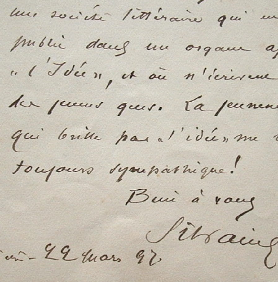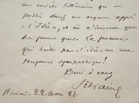 Il accepte son invitation «parce que je ne refuserai jamais de dire des vers pour une société littéraire qui en publie dans un organe appelé "l'Idée", et où n'écrivent que des jeunes gens. La jeunesse qui brille par "l'idée" me sera toujours sympathique !».