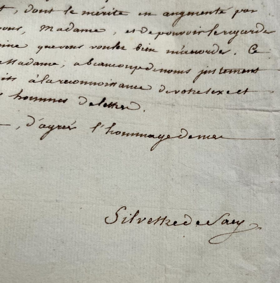 Rare lettre d'Antoine-Isaac Silvestre de Sacy à la femme de lettres féministe Fortunée Briquet, au sujet de la publication de son Dictionnaire historique, littéraire et bibliographique des Françaises et des étrangères naturalisées en France (1804).