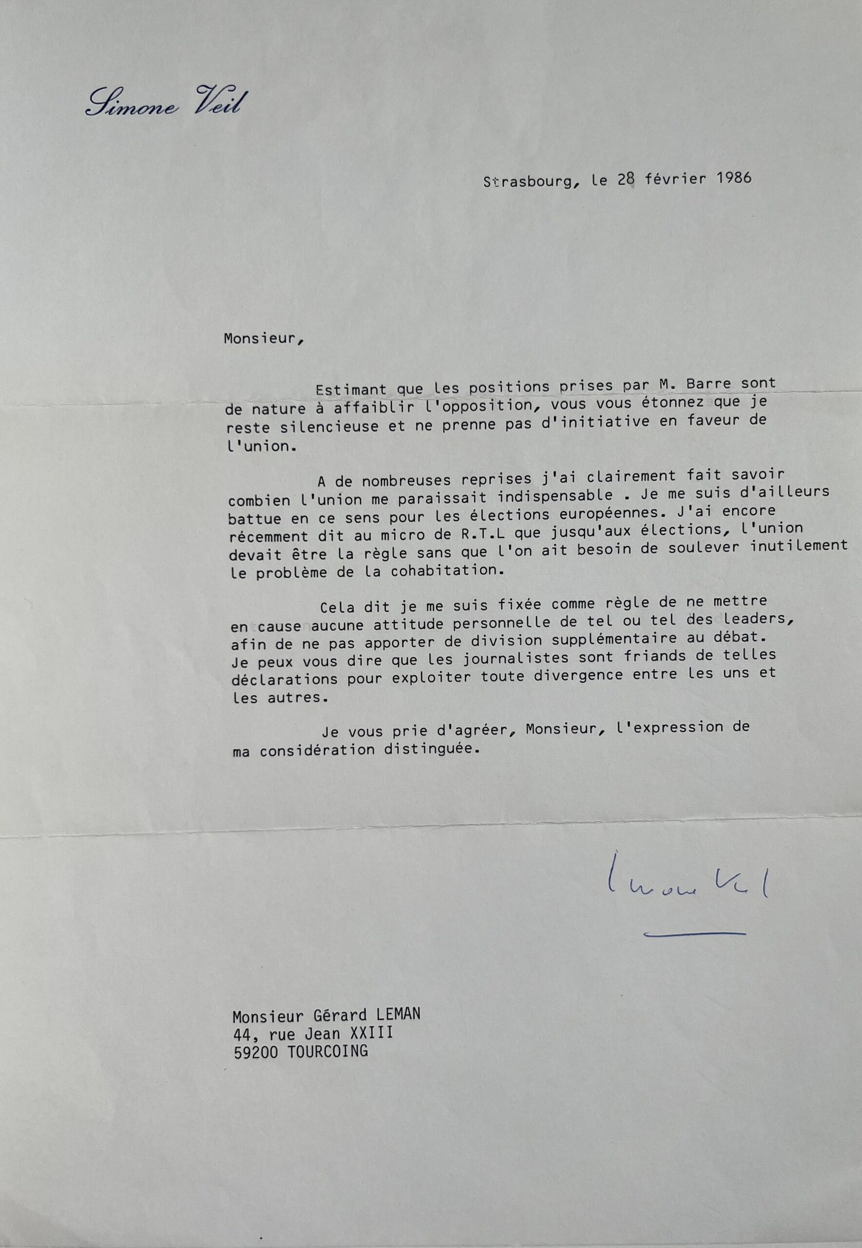 Intéressante lettre politique de Simone Veil, écrite durant la campagne pour les élections législatives, et qui résume parfaitement son état d'esprit. La victoire de la Droite, deux semaines plus tard, le 16 mars 1986, engendrera la première cohabitation, Jacques Chirac devenant Premier Ministre de François Mitterrand.