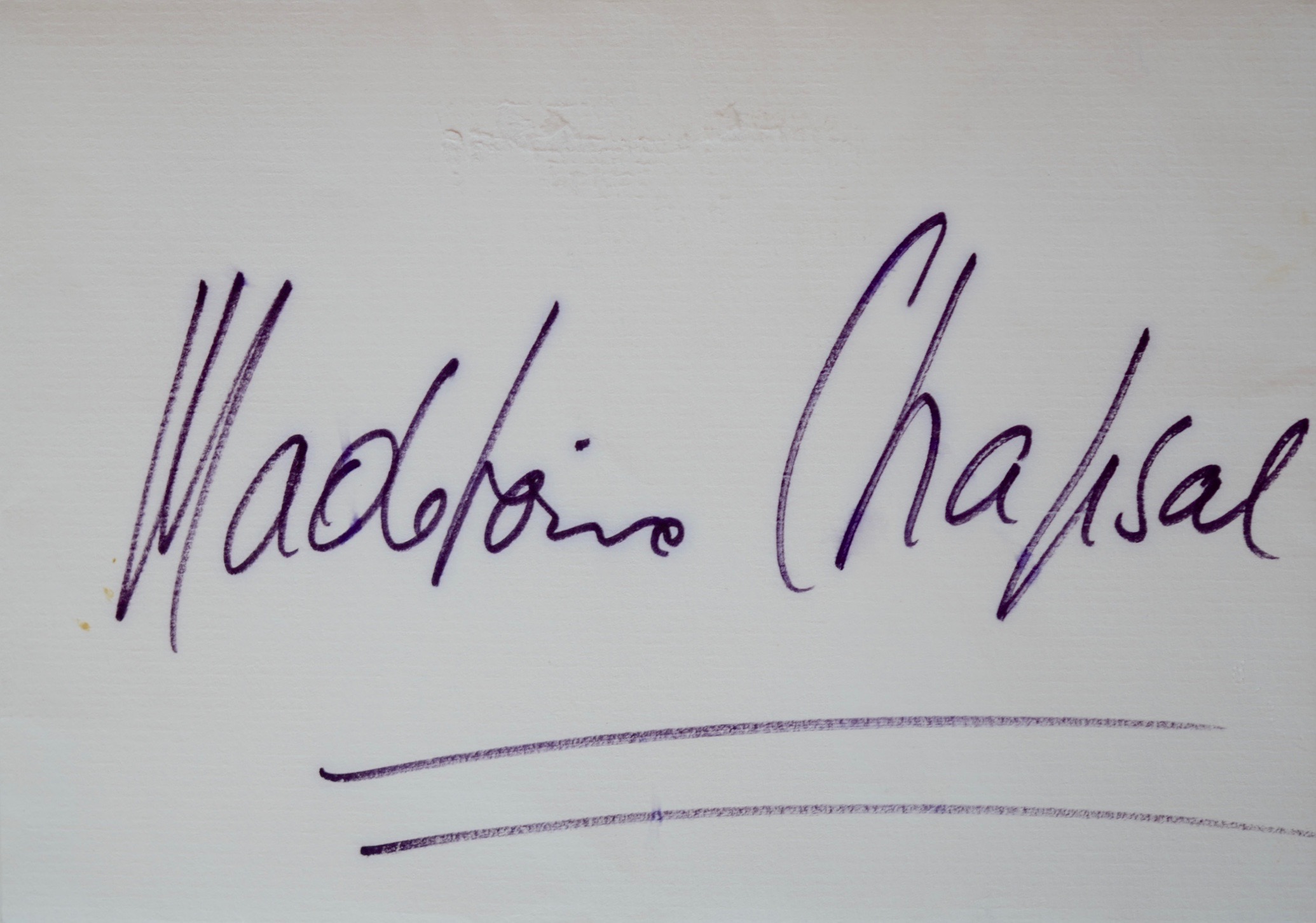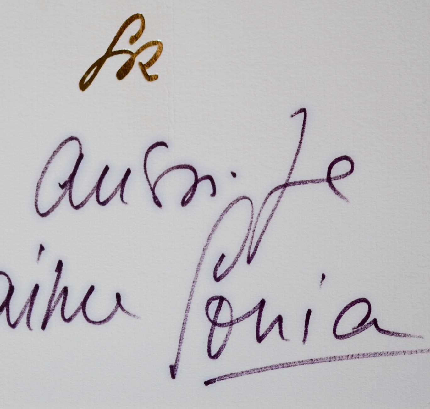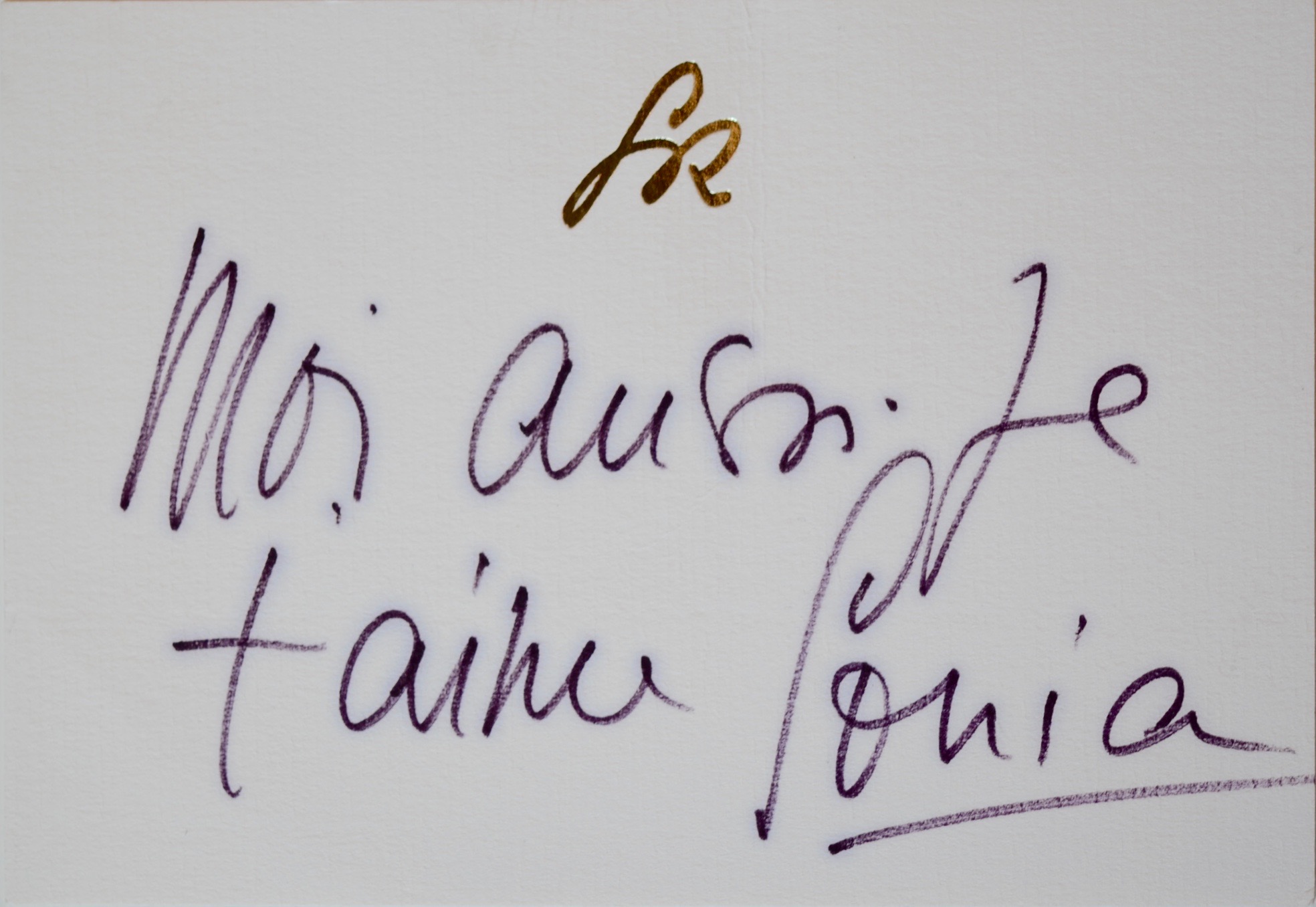 Jolie carte autographe signée de Sonia Rykiel, adressée à son amie, l'écrivain et journaliste Madeleine Chapsal :"Moi aussi je t'aime. Sonia".
