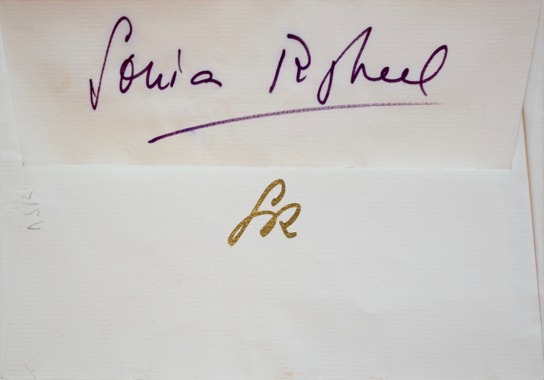 Enveloppe conservée avec nom du destinataire et revers signé par Rykiel. Feutre violet sur papier vergé. La carte et l'enveloppe portent le monogramme doré "SR".