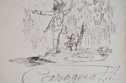 Dessin à l'encre représentant un explorateur qui arrive sur les bords d'un lac, les bois d'un caribou sur l'épaule, une forêt de pins derrière lui, avec cette légende : "Carognes!!! Excursion au havre de Hawke Anse à Keppel, 19 août 1878".
