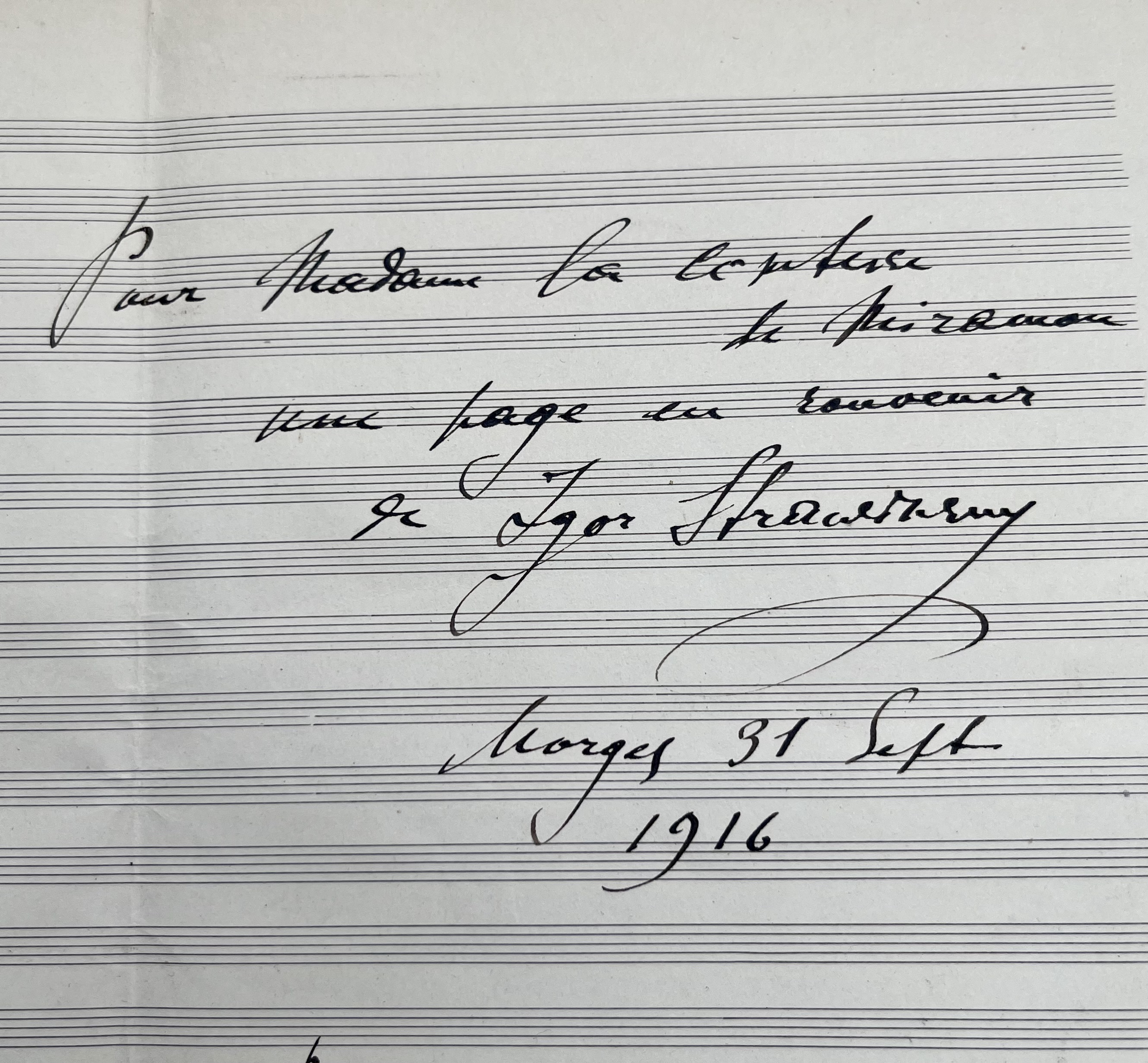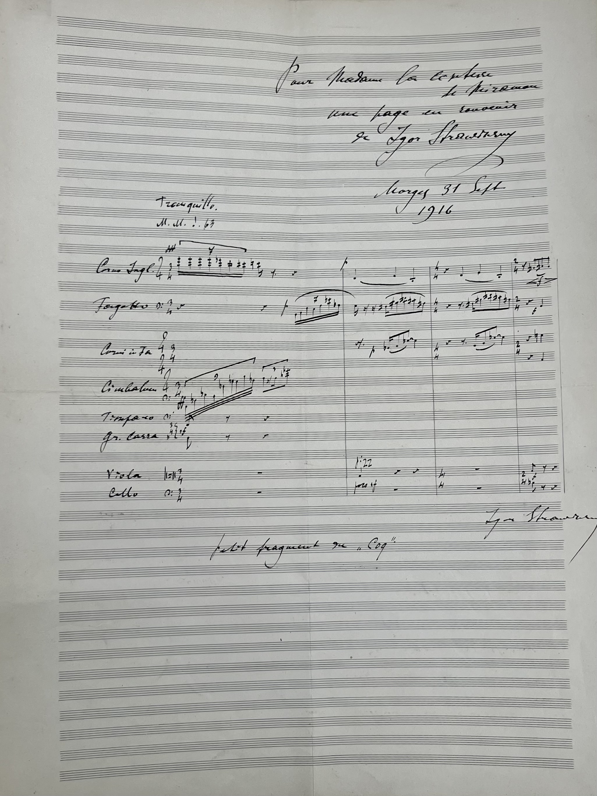 Le compositeur a copié et dédicacé cet extrait musical "Pour Madame la comtesse de Miramon, une page en souvenir de Igor Stravinsky", avec la précision "petit fragment du "Coq".