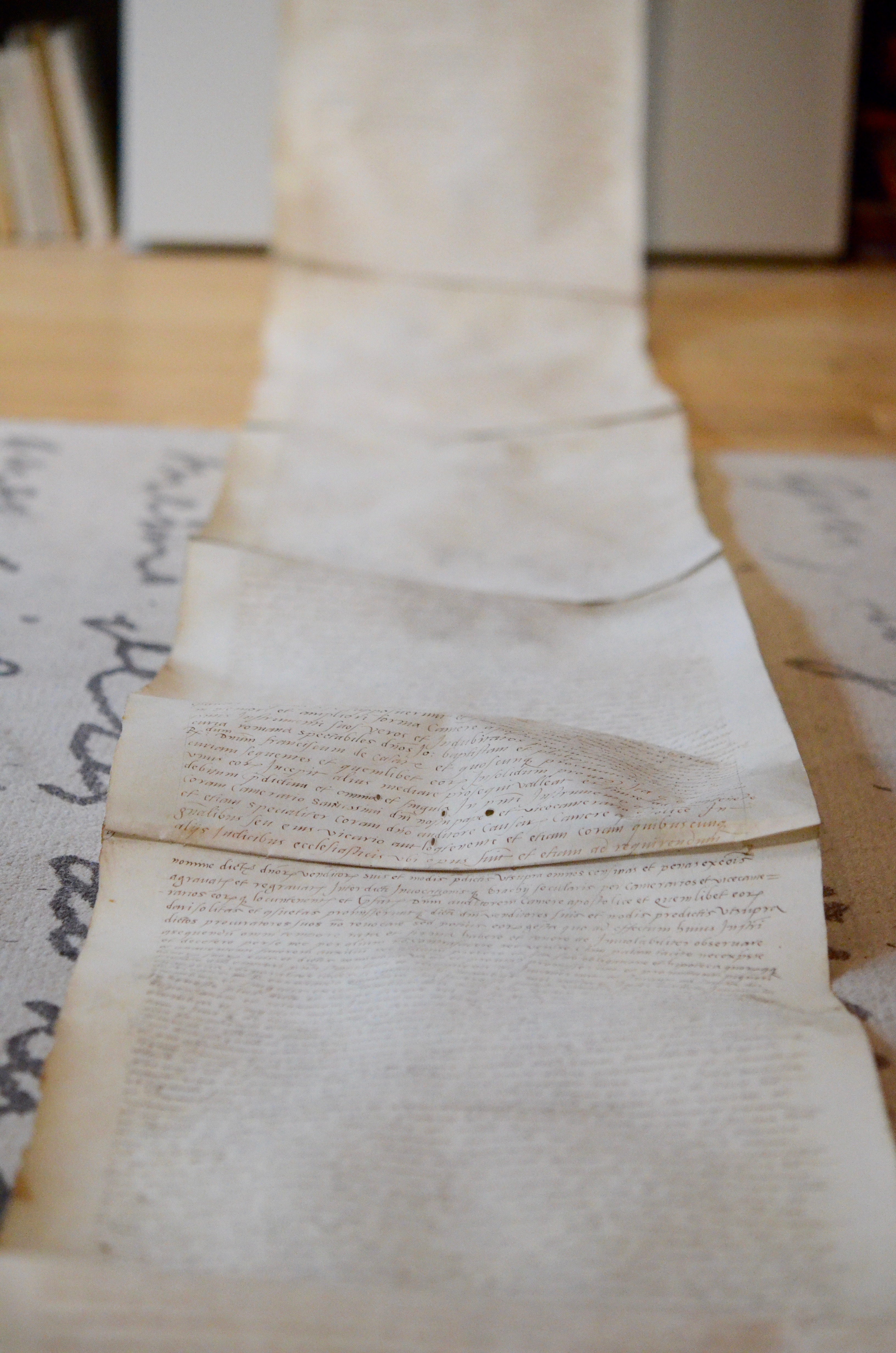 Spectaculaire rouleau de parchemin italien de plus de 4 mètres de longueur, daté de 1526