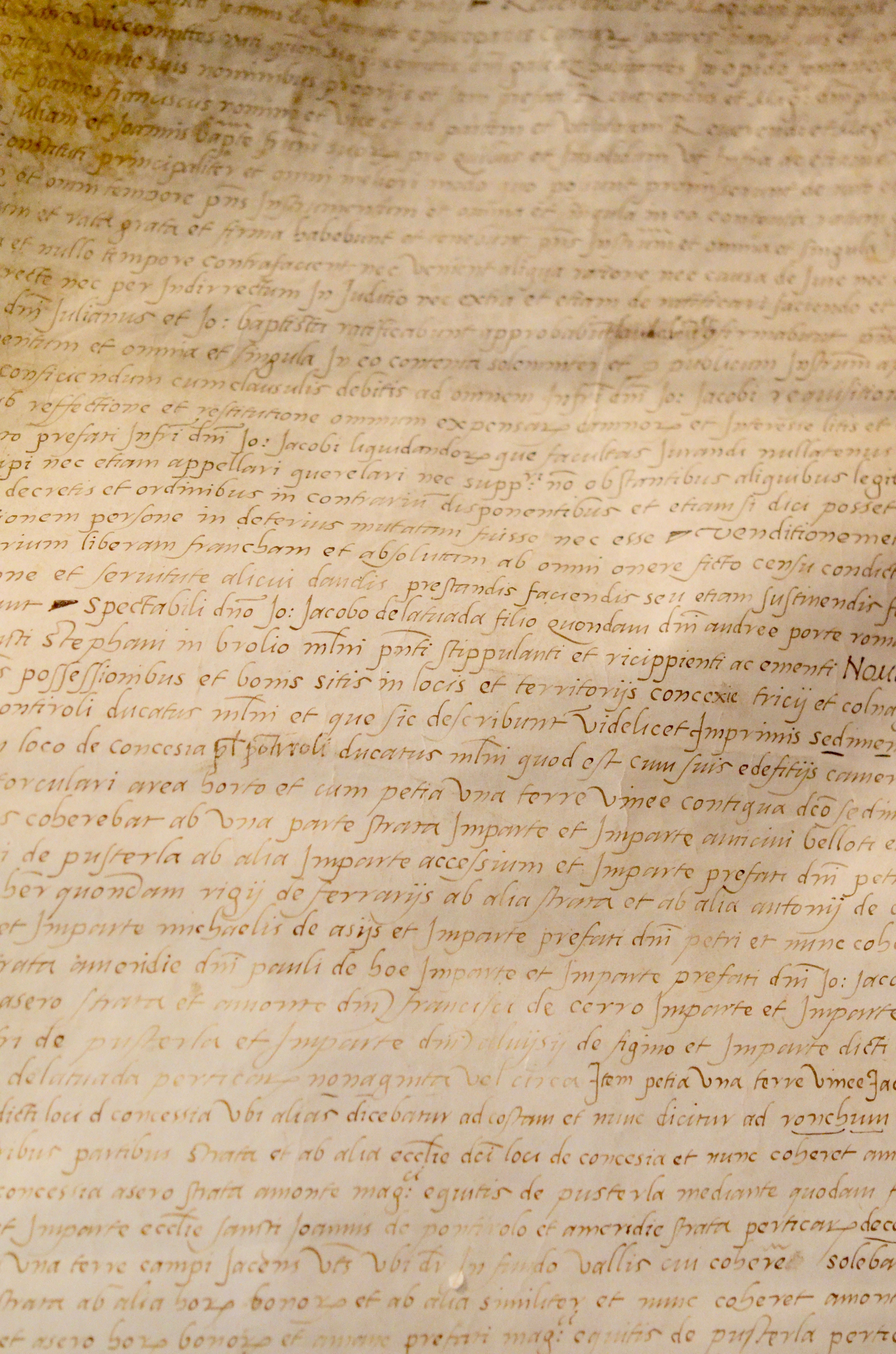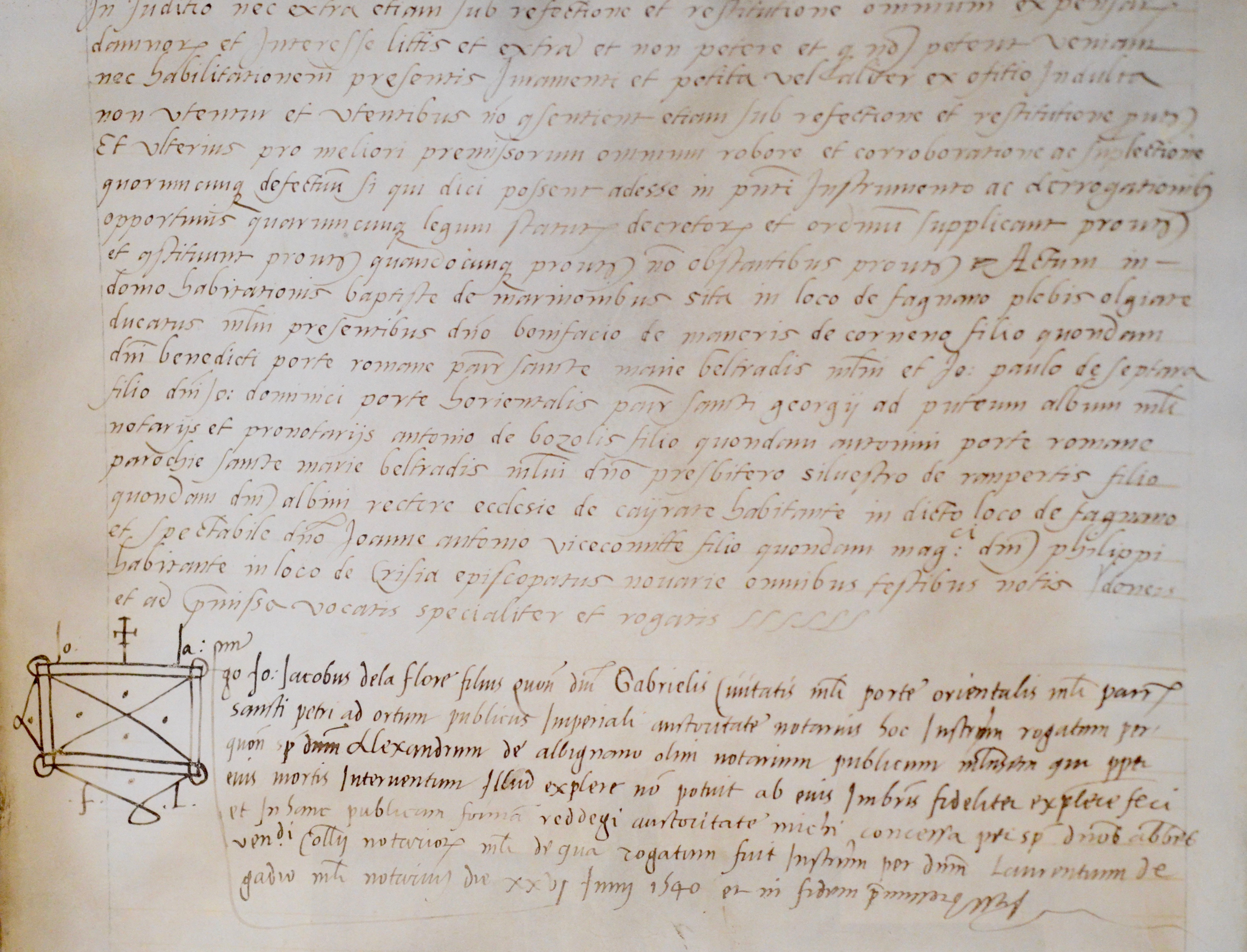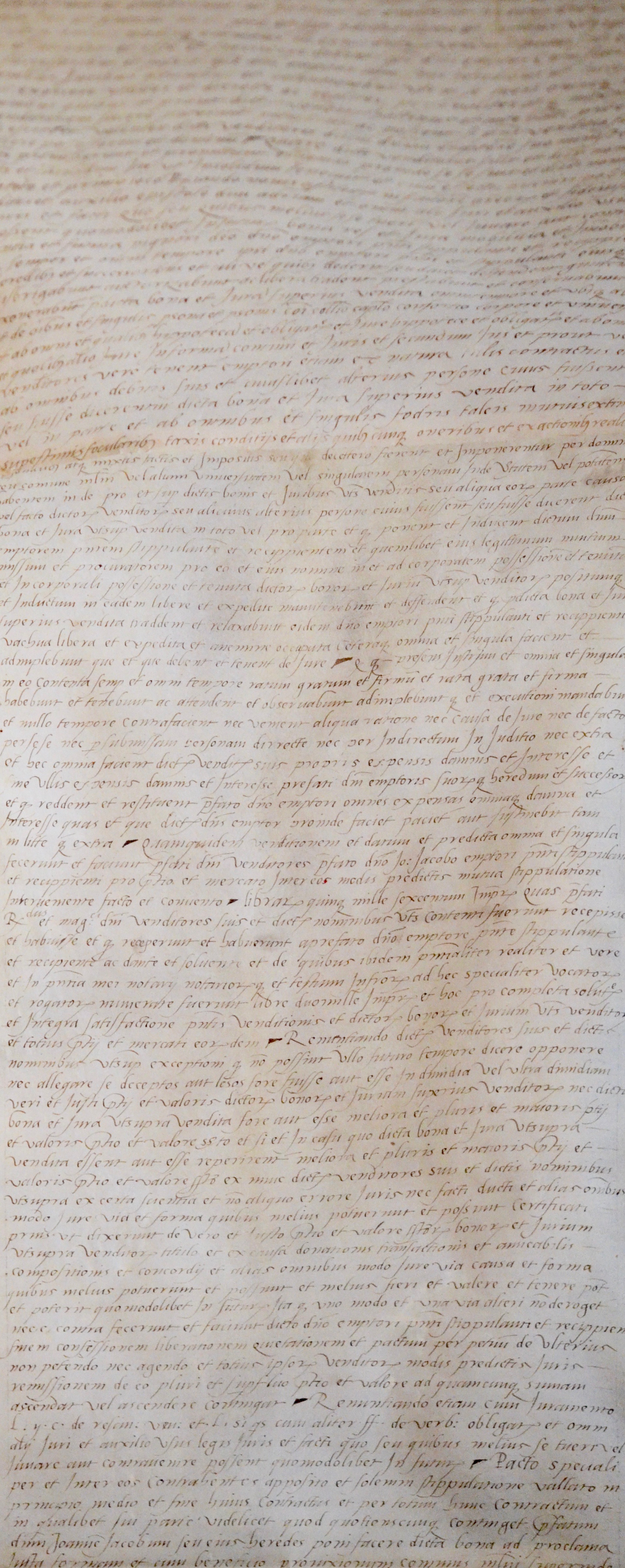Spectaculaire rouleau de parchemin en très bel état de conservation. L'an 1526 le révérend Philippe-Marie abbé de l'abbaye St-Jean de Vertemate, diocèse de Côme, Jean-François et Jean-Gabriel frères, vicomtes, fils du feu comte Galeas [Visconti ?], habitants de Fontaneto (d'Agogna), diocèse de Novare, font vente libre de toute charge, condition et servitude à Messire Jean-Jacques de Latuade fils de feu Messire André de la Porte Romaine (à Milan), paroisse St-Etienne du Breuil (Brolio), de biens situés dans le duché de Milan à Pontiroli (entre Milan et Bergame) dont la description est contenue dans le reste du document.