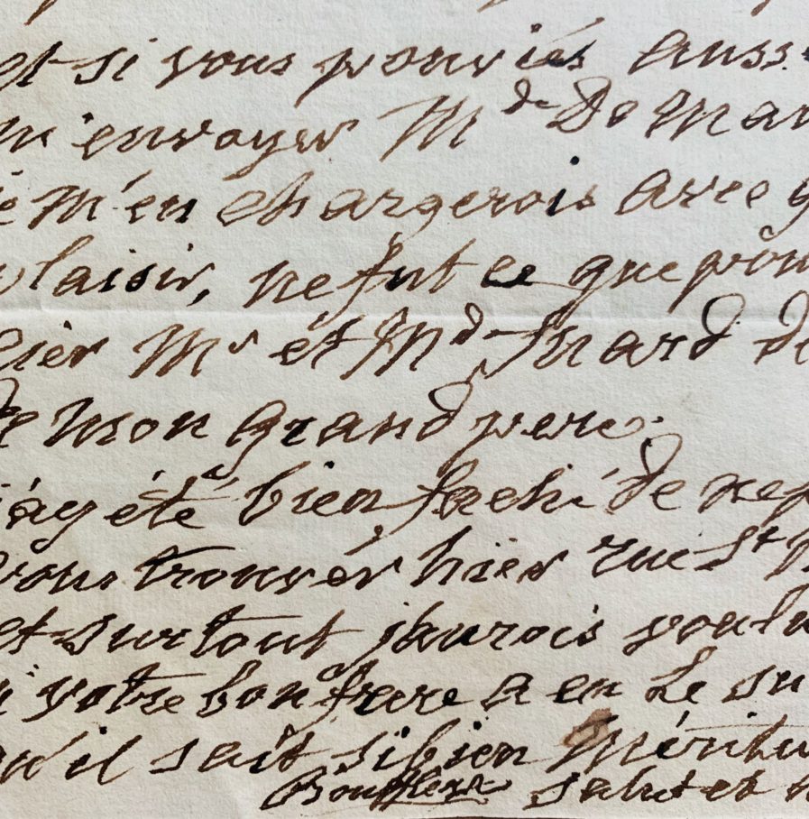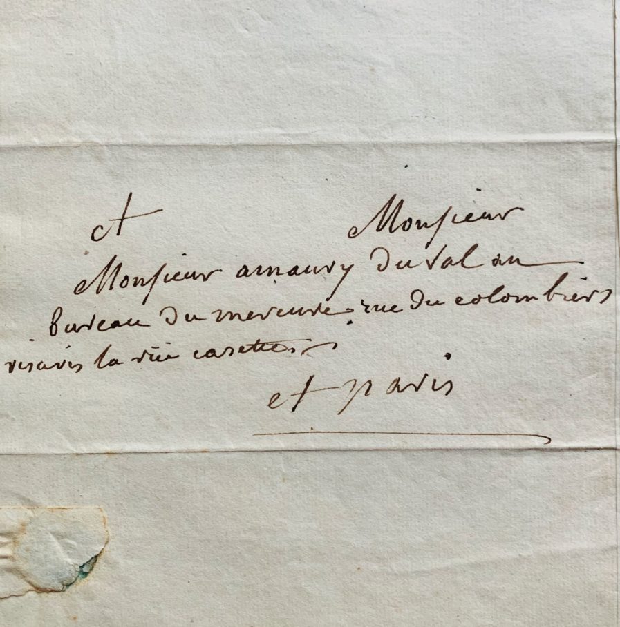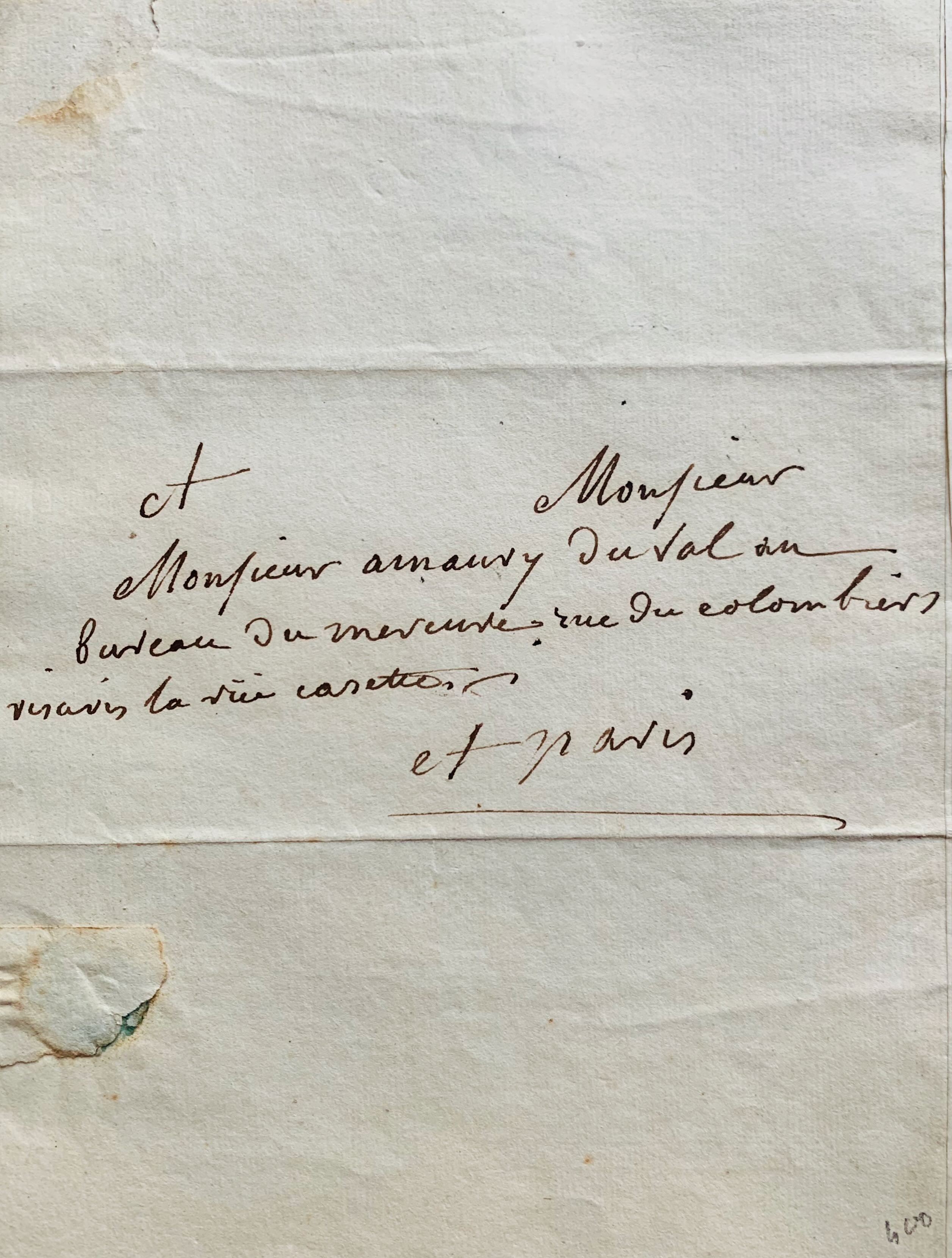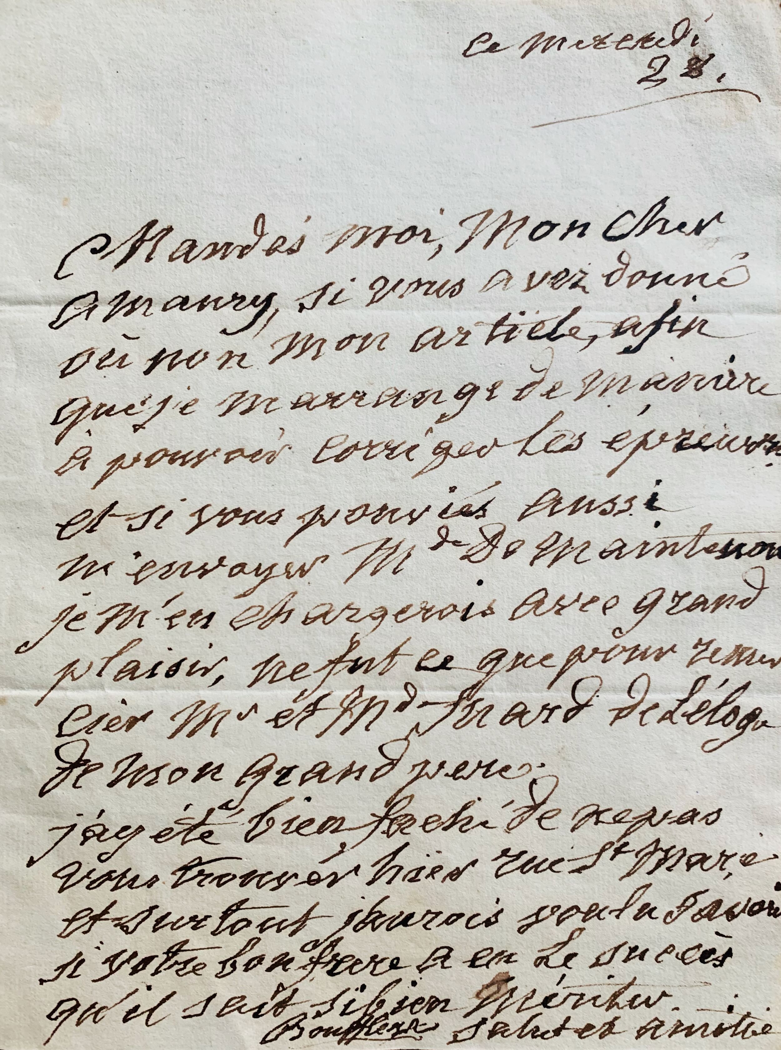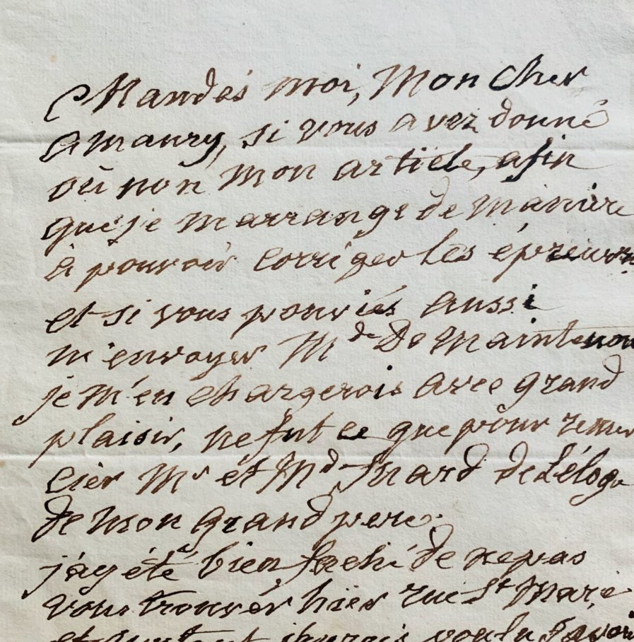 "Mandés moi, mon cher Amaury, si vous avez donné ou non mon article, afin que je m'arrange de manière à pouvoir corriger les épreuves et si vous pouviez aussi m'envoyer Mde de Maintenon. Je m'en chargerai avec grand plaisir, ne fut ce que pour remercier Mr et Mde Inard de l'éloge de mon grand père [...]".