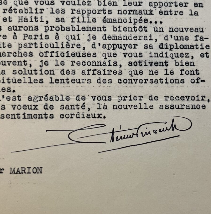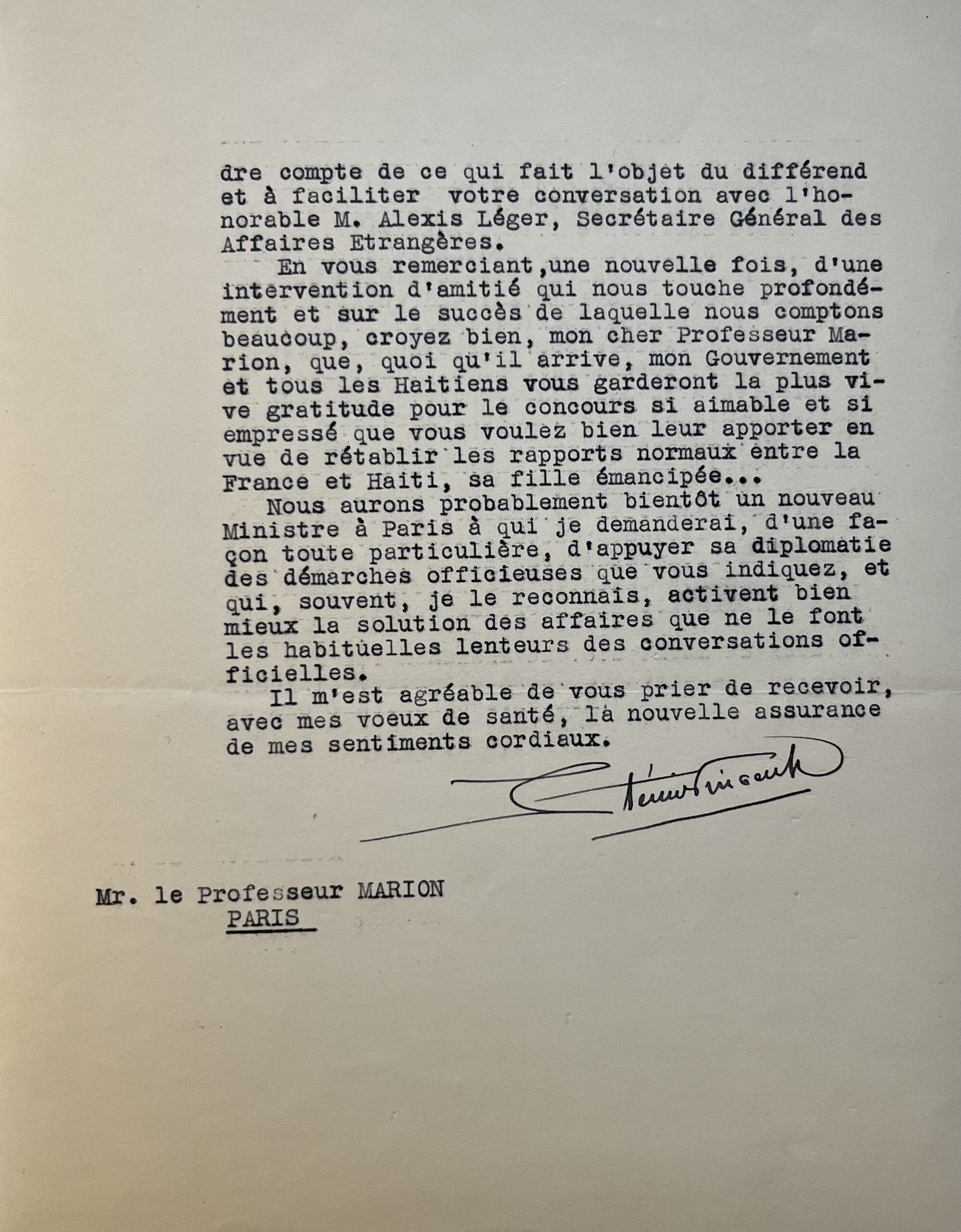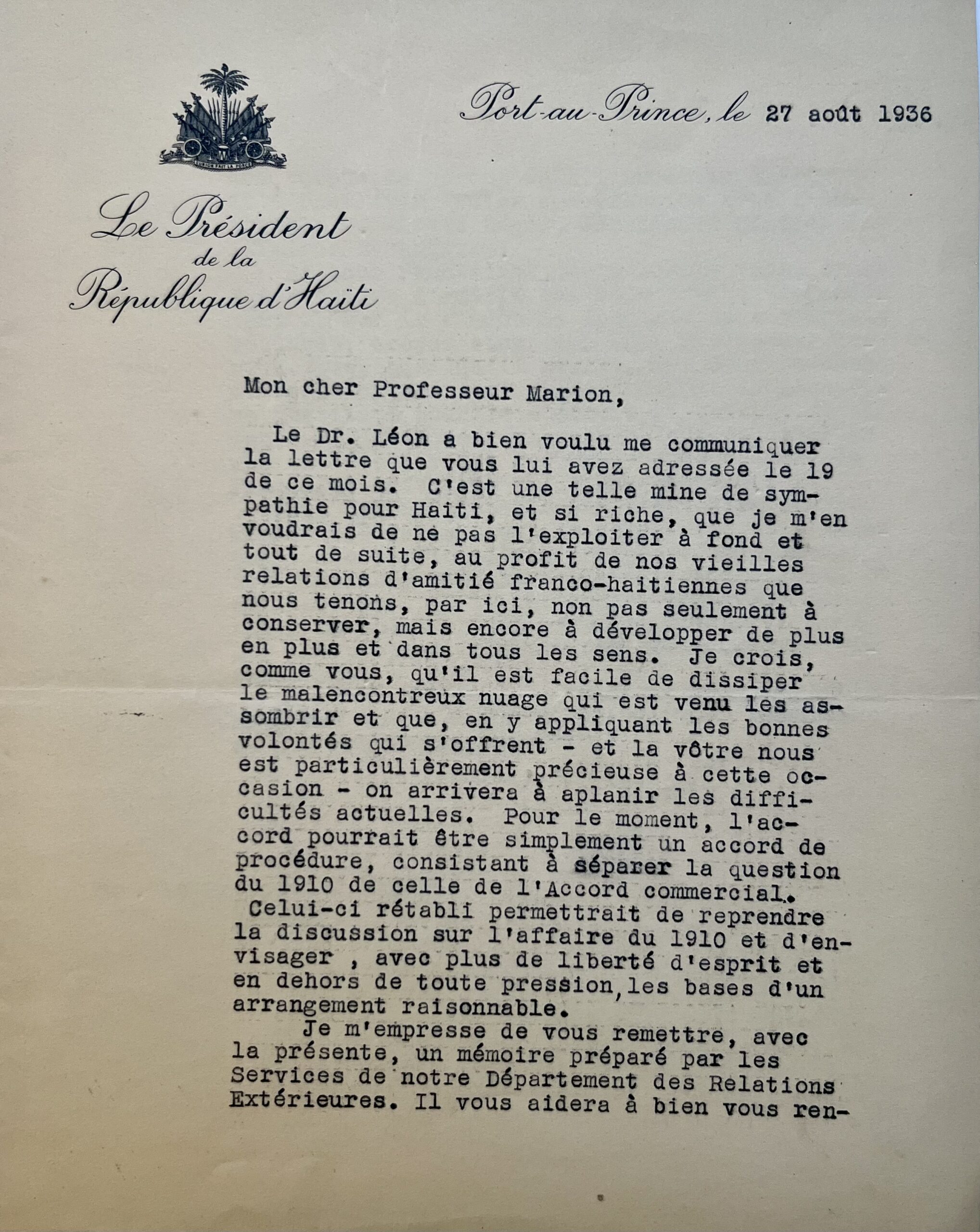 Sténio Vincent ( Port-au-Prince, 1874 /1959)"Le Dr. Léon a bien voulu me communiquer la lettre que vous lui avez adressée le 19 de ce mois. C'est une telle mine de sympathie pour Haiti, et si riche, que je m'en voudrais de ne pas l'exploiter à fond et tout de suite, au profit de nos vieilles relations d'amitié franco-haitiennes que nous tenons, par ici, non pas seulement à conserver, mais encore à développer de plus en plus et dans tous les sens. Je crois, comme vous, qu'il est facile de dissiper le malencontreux nuage qui est venu les assombrir et que, y appliquant les bonnes volontés qui s'offrent - et la vôtre nous est particulièrement précieuse à cette occasion - on arrivera à aplanir les difficultés actuelles. Pour le moment, l'accord pourrait être simplement un accord de procédure, consistant à séparer la question du 1910 de celle de l'Accord commercial. Celui-ci rétabli permettrait de reprendre la discussion sur l'affaire du 1910 et d'envisager, avec plus de liberté d'esprit et en dehors de toute pression, les bases d'un arrangement raisonnable. Je m'empresse de vous remettre, avec la présente, un mémoire préparé par les Services de notre Département des Relations Extérieures. Il vous aidera à bien vous rendre compte de ce qui fait l'objet du différend et à faciliter votre conversation avec l'honorable M. Alexis Léger [Saint-John Perse], secrétaire Général des Affaires Etrangères. En vous remerciant, une nouvelle fois, d'une intervention d'amitié qui nous touche profondément et sur le succès de laquelle nous comptons beaucoup, croyez bien, mon cher Professeur Marion, que, quoi qu'il arrive, mon Gouvernement et tous les Haitiens vous garderont la plus vive gratitude pour le concours si aimable et si empressé que vous voulez bien leur apporter en vue de rétablir les rapports normaux entre la France et Haiti, sa fille émancipée... Nous aurons probablement bientôt un nouveau Ministre à Paris à qui je demanderai, d'une façon toute particulière, d'appuyer sa diplomatie des démarches officieuses que vous indiquez, et qui, souvent, je le reconnais, activent bien mieux la solution des affaires que ne le font les habituelles lenteurs des conversations officielles."