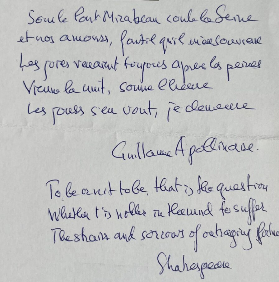 -La première est un mythique poème d'Apollinaire : "Sous le pont Mirabeau coule la Seine / et nos amours, faut-il qu'il m'en souvienne / Les joies venaient toujours après les peines [La joie venait toujours après la peine] / Vienne la nuit, sonne l'heure / Les jours s'en vont je demeure. Guillaume Apollinaire".