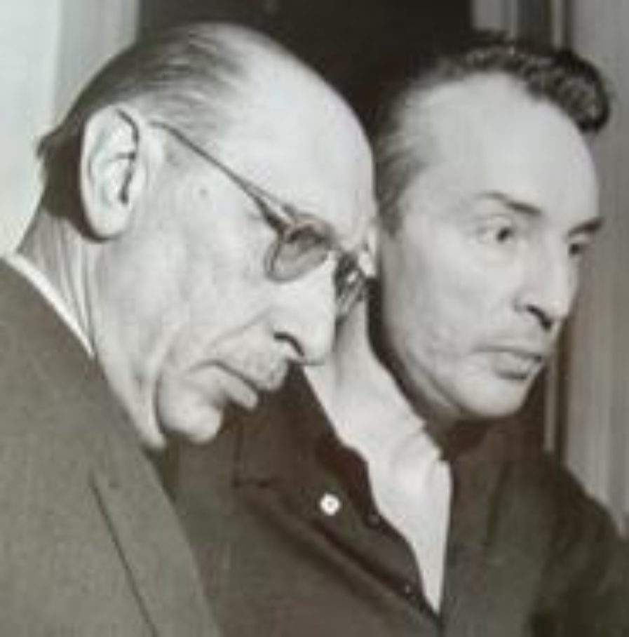 Photographie représentant Stravinski et le chorégraphe George Balanchine, l'oeil attentif, durant une séance de travail. (Balanchine, d'origine russe, a travaillé à plusieurs reprises, avec sa troupe du New York City Ballet, sur des ballets de Stravinski).