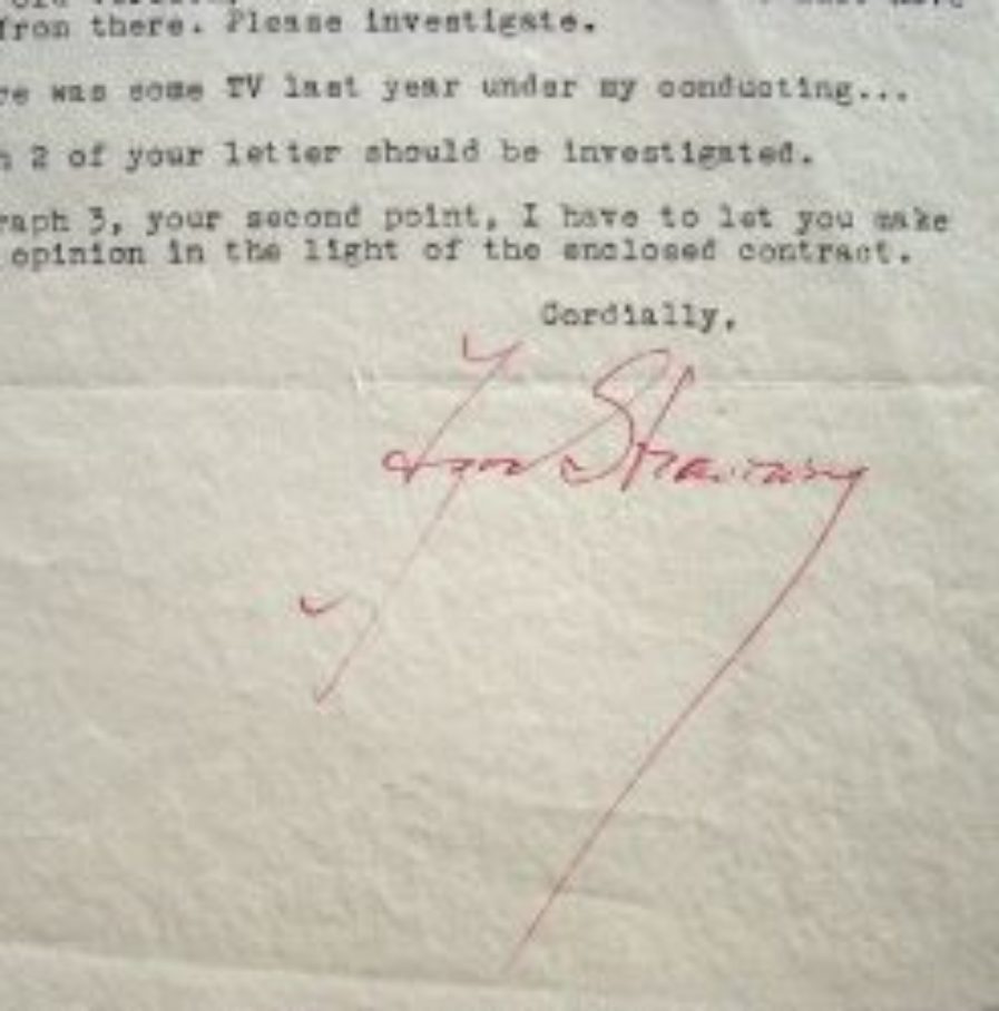 Igor Stravinsky (Oranienbaum (Russie), 1882/1971)Stravinski vient de recevoir sa rétribution pour l'exécution du ballet l'Oiseau de Feu, mais il se dit étonné par son montant. «I say "strange" because, outside of ballet performances, everything else is missing». Il explique qu'il a dirigé de nombreuses fois la pièce dans sa nouvelle version, mais jamais dans sa forme primitive et que les dividendes devraient être accrus. «I have myself played the Firebird Suite many times (I never play the old version) and therefore some revenue must have accrued from there». Il demande des vérifications à ce sujet et ajoute qu'il a aussi dirigé pour la télévision. «Also there was some TV last year under my conducting [...]». Stravinski engage Weissberger à vérifier ses comptes et les conditions de son contrat.