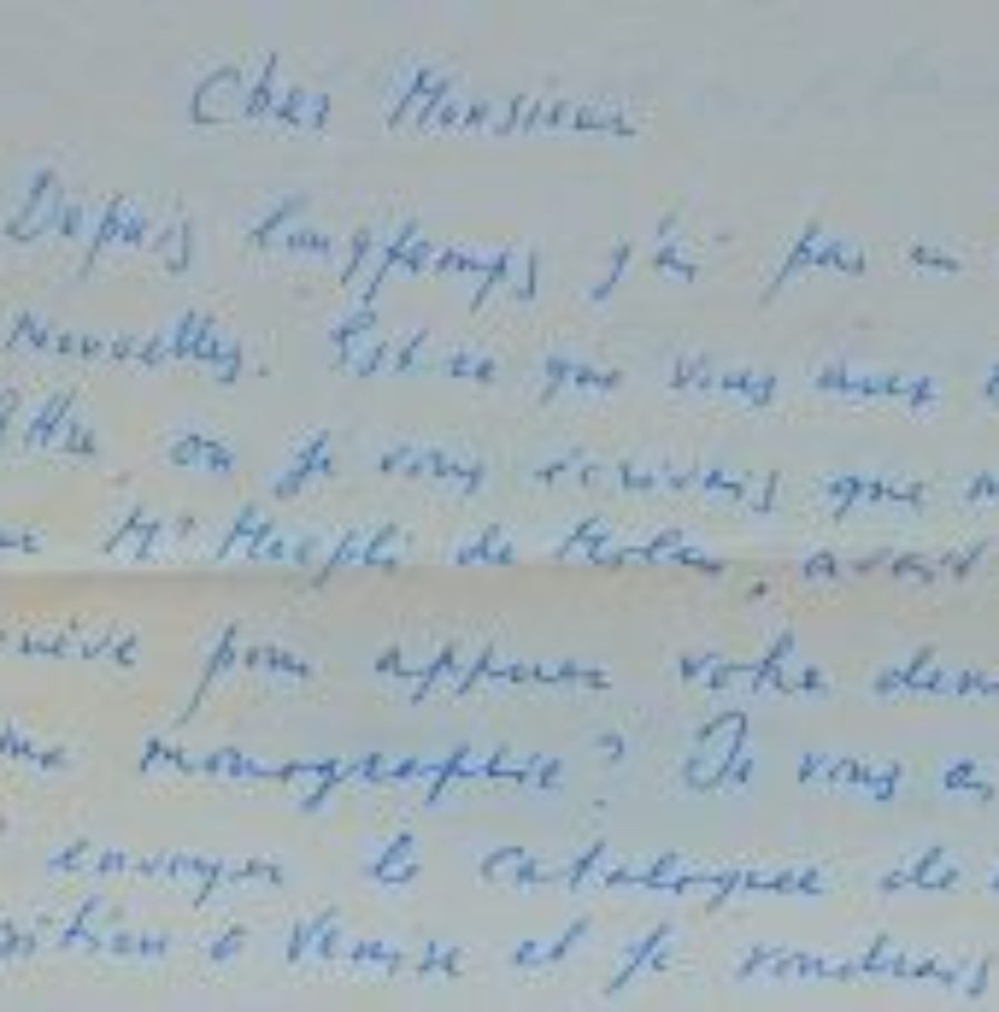 Le peintre Gregorio Sciltian donne des nouvelles de ses expositions et l'informe du soutien possible de son éditeur Moepli pour une monographie. "Je vous ai aussi envoyé le catalogue de mon exposition à Venise et je voudrais aussi savoir si votre article est apparu dans "Les Jardins des Arts"? Mon exposition à Venise obtient un très grand succès surtout aussi comme contre poids à la Biennale [...]". Il donne son adresse sur les hauteurs du lac de Garde "où j'ai mon atelier et où je travaille pendant l'été".