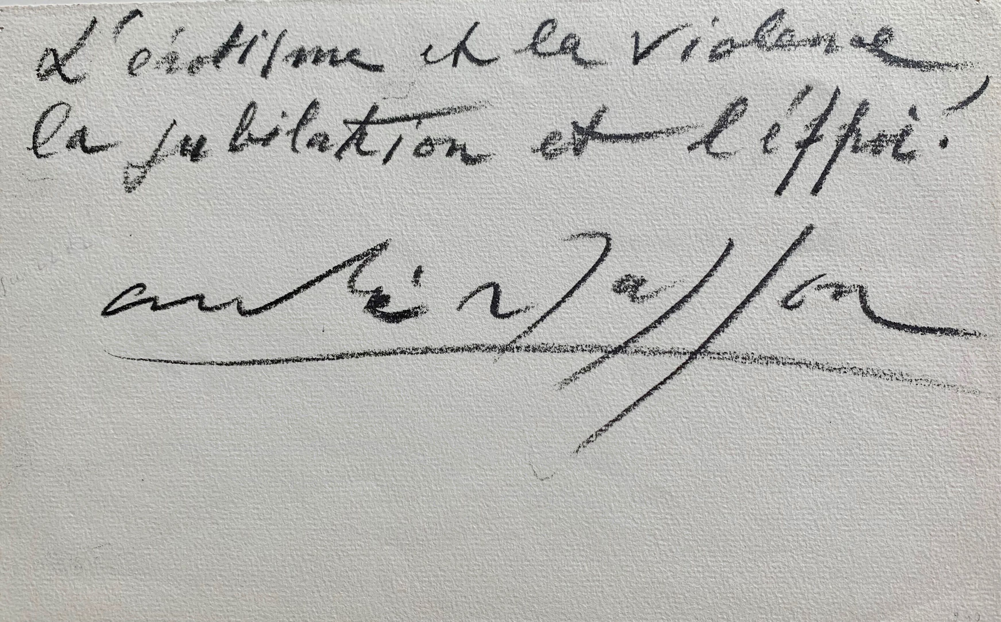 Sur un papier vergé épais, au crayon gras, André Masson a écrit cette sulfureuse maxime qui résume son oeuvre : "L'érotisme et la violence, la jubilation et l'effroi. André Masson".