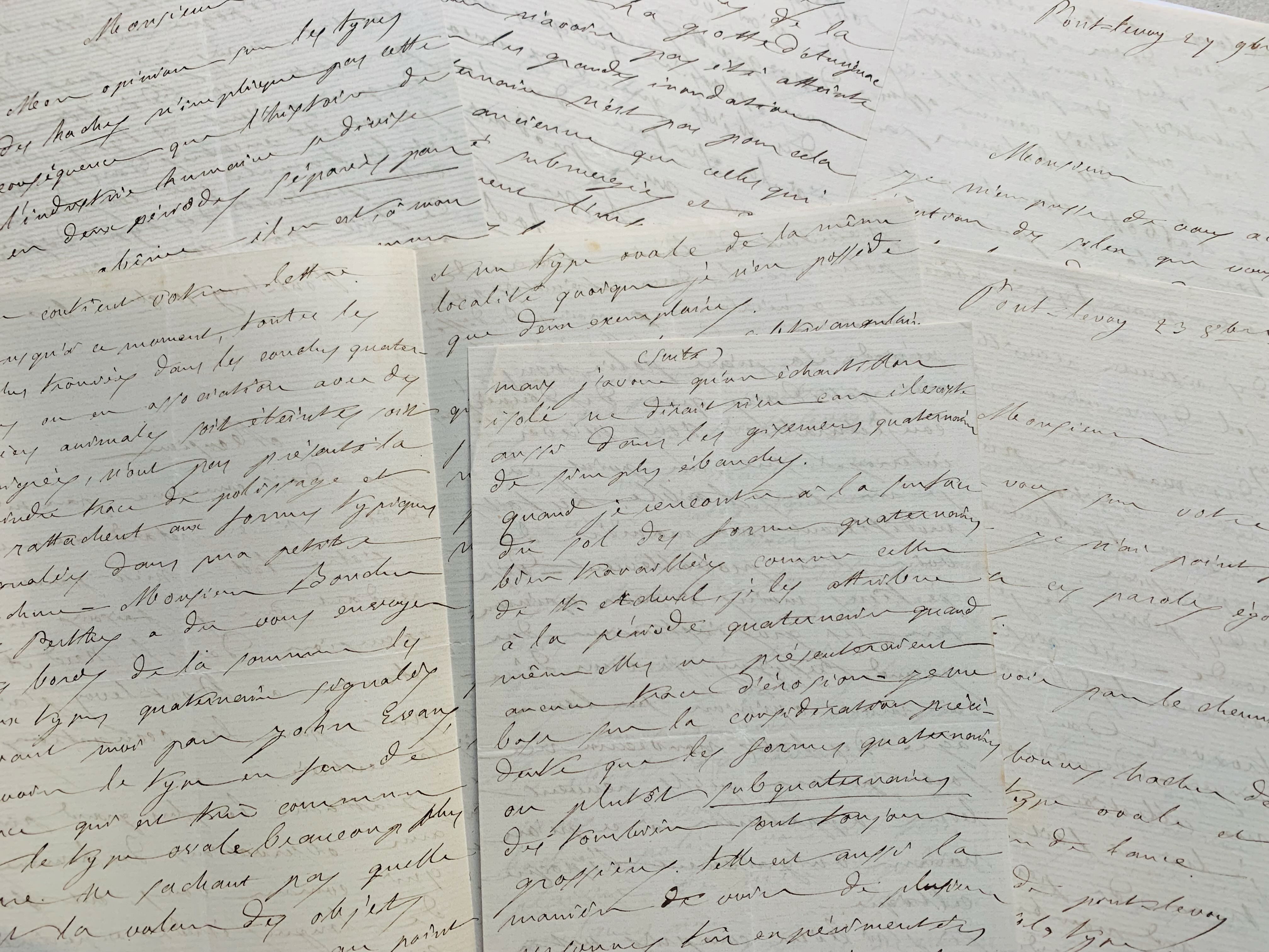 Louis-Alexis Bourgeois (Artins (Loir-et-Cher), 1819/1878)Très longue et superbe correspondance entièrement consacrée à ses découvertes, et ses théories sur la datation des haches et outils préhistoriques et sur l’époque de l’existence des premiers hommes. « J’attache le plus grand crédit aux observations des hommes qui, comme vous, ont fait de longues études expérimentales sur les instruments de pierre […]. Jusqu’à ce moment, toutes les haches trouvées dans les couches quaternaires ou en association avec des espèces animales soit éteintes, soit émigrées, n’ont pas présenté la moindre trace de polissage et se rattachent aux formes typiques signalées dans ma petite brochure. M. Boucher de Perthes a du vous envoyer des bords de la Somme les deux types quaternaires signalés avant moi par John Evans, savoir le type en fer de lance qui est très commun et le type ovale beaucoup plus rare […]. Quand je rencontre à la surface du sol des formes quaternaires bien travaillées comme celles de St Acheul, je les attribue à la période quaternaire quand même elles ne présenteraient aucune trace d’érosion. Je me base sur la considération précédente que les formes quaternaires ou plutôt subquaternaires des tourbières sont toujours grossières. Telle est aussi la manière de voir de plusieurs personnes très expérimentées que j’ai consultées. Mais il faut bien dire que pour cette période qui a précédé immédiatement la période de la pierre polie, nous ne possédons que des données conjecturales. Vous m’avez interrogé sur un point où je me sens faible. Les faits modifieront ma manière de voir très probablement. Déjà je tiens moins à mon opinion sur les gros instruments du Grand-Bassigny, je veux dire à mon opinion sur leur âge. Des faits nouveaux me font penser qu’ils peuvent bien appartenir à ce qu’on nomme vulgairement l’époque celtique […] ». « Mon opinion sur les types de haches n’implique pas cette conséquence que l’histoire de l’industrie humaine se divise en deux périodes séparées par un abime. Il en est, à mon avis, de ces époques comme des époques géologiques, comme des époques historiques… Nous ne pouvons établir entre elles une ligne de démarcation mathématique et pourtant nous sommes obligés de les admettre. Sans doute je ne pourrai pas démontrer par des preuves positives que les haches du type ovale ou du type en fer de lance trouvées à la surface du sol appartiennent à l’époque des espèces éteintes, mais j’y suis autorisé par cette considération que jusqu’à présent ces types n’ont jamais été rencontrés dans les dolmens ou les tumuli qui constamment ont présenté des types différents. Ce fait par son universalité acquiert une grande valeur. Je pense comme vous, monsieur, qu’il a dû exister une époque de transition à laquelle nous devons peut-être rapporter les haches grossières de la Somme […] ». Les autres lettres sont tout aussi intéressantes.