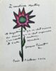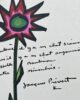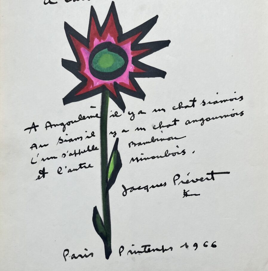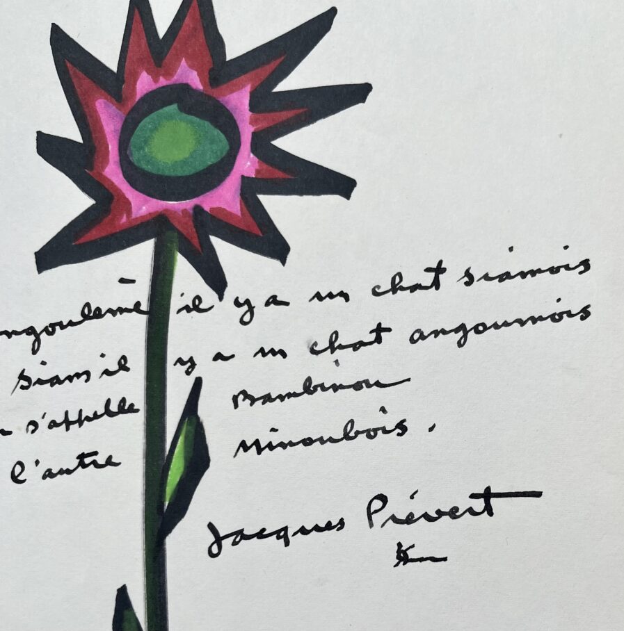 Dessin très coloré, d'une grande fleur, réalisé par Jacques Préver aux feutres de couleur. Il est dédié "À Caroline Martin", et l'accompagne d'un poème à la Prévert, autour du chat et d'Angoulême, ville de résidence de Caroline Martin.