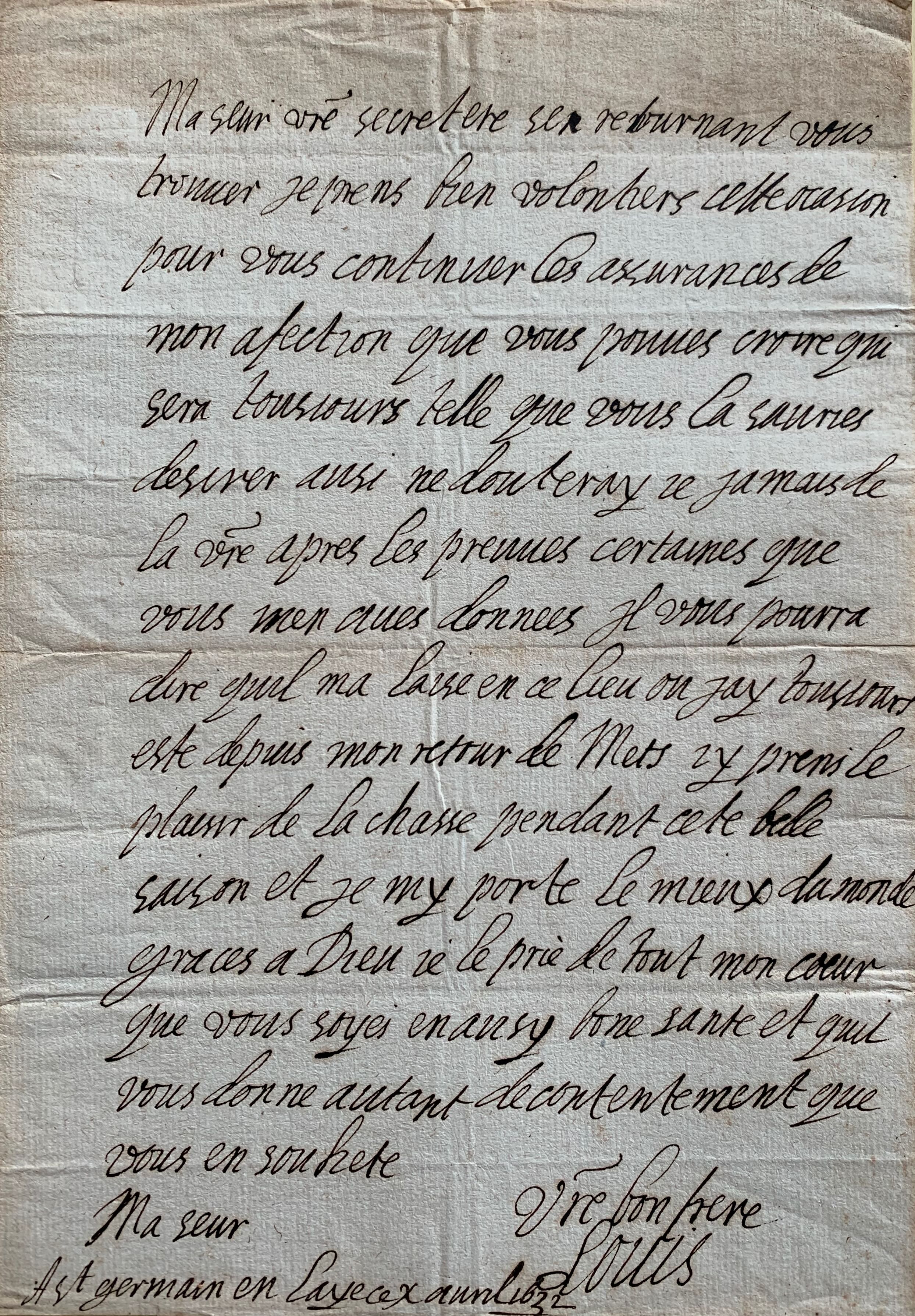 "Ma seur, vre secretere sen retournant vous trouver je prens bien volontiers cette occasion pour vous continuer les assurances de mon afection que vous pouvez croire qui sera tousiours telle que vous la sauries desirer ausi ne douteray ie jamais de la vre apres les preuves certaines que vous men aves donnees. Il vous pourra dire quil ma laisé en ce lieu ou jay tousiours este depuis mon retour de Mets. Jy prens le plaisir de la chasse pendant cete belle saison et je my porte le mieux du monde graces a Dieu ie le prie de tout mon coeur que vous soyes en ausy bone sante et qu'il vous donne autant de contentement que vous en souhete".