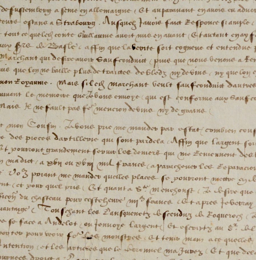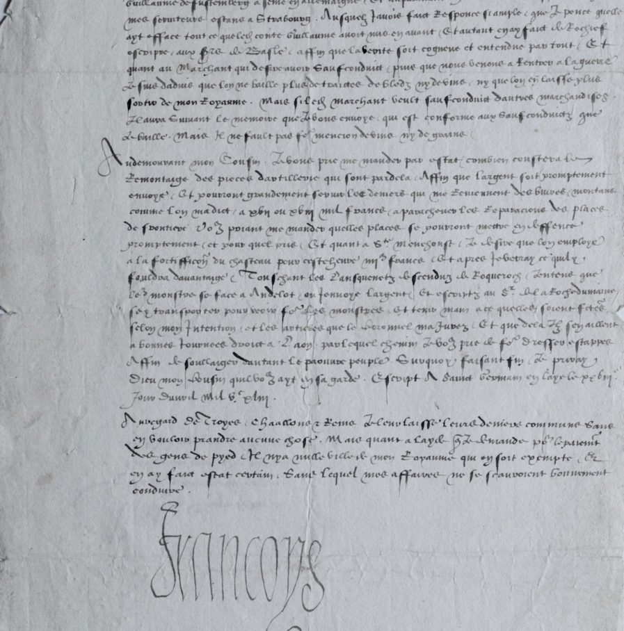 Le Roi confirme avoir reçu son courrier du 23 avril dernier et promet l’envoi de 2000 francs pour le blocus devant Lumes, dans les Ardennes "pour les garder et empescher de faire les saillies quels ont acoustumez faire au domaine de mes subjetz. Mais il fault considérer sil pourra estre faict de brief de quelle force il fauldra entretenir pour asseurer les ouvriers. Et si après quil sera fait se pourra garder avecques peu de despence". Il évoque également le comte protestant Guillaume de Furstemberg (1491-1549). Pareillement j'ay entendu par voz lettres ce que le comte Guillame de Furstemberg a semé en Allemaigne, et auparavant en avoir eu avertissement par mes serviteurs estant à Strasbourg. Auxquels j'avois faict response si ample que je pense qu'elle ayt effacé tout ce que le comte Guillaume avoit mis en avant et autant en ayt faict derechef escripre aux Srs de Basle, affin que la vérité soit cogneue et entendue par tout. Et quant au marchant qui désire avoir saufconduit, puisque nous venons de rentrer à la guerre, je suis dadvis qu'on ne vaille plus de traiter de bleds ni de vins, ny que l'on en laisse plus sortir de mon Royaume. Mais si led. marchant veult saufconduit d'autres marchandises, il aura suivant le mémoire que je vous envoie [...] mais il ne fault pas faire mention de vins ny de graines [...]". Ce dernier, passé au service de la France se retournera contre François Ier par la suite.