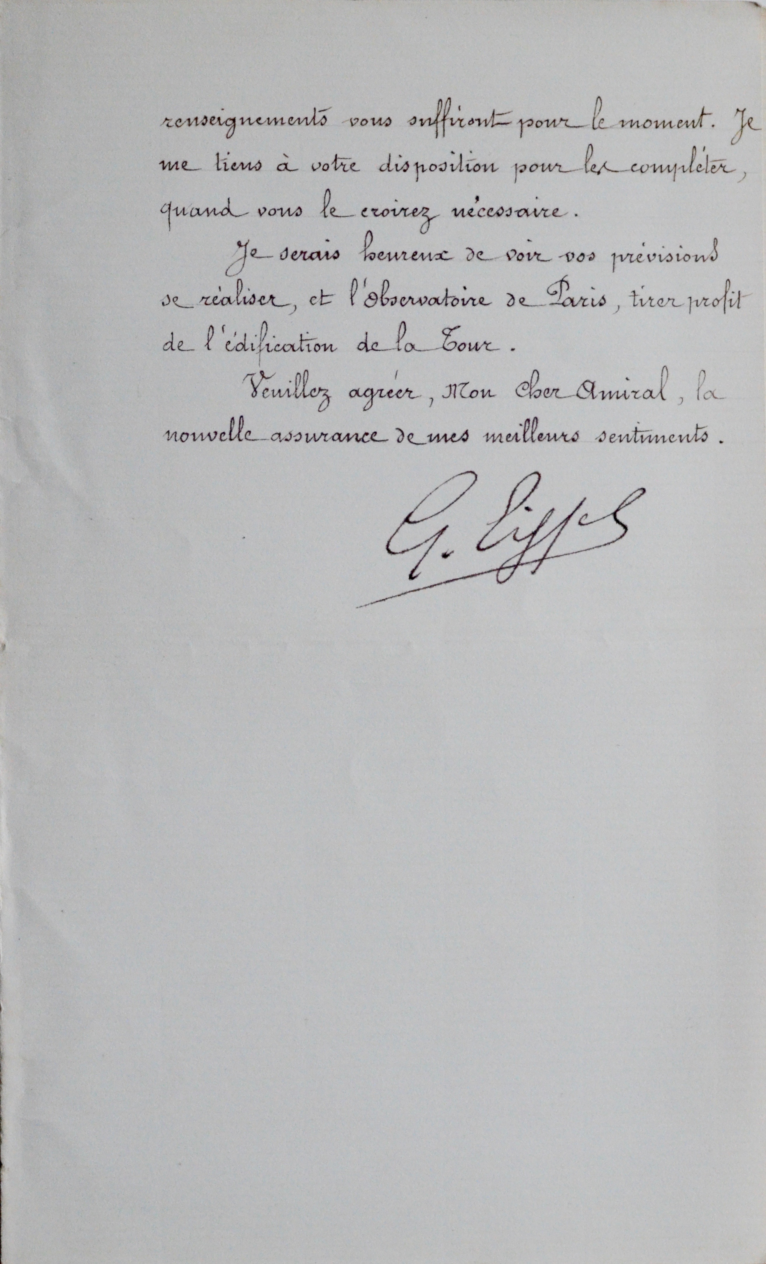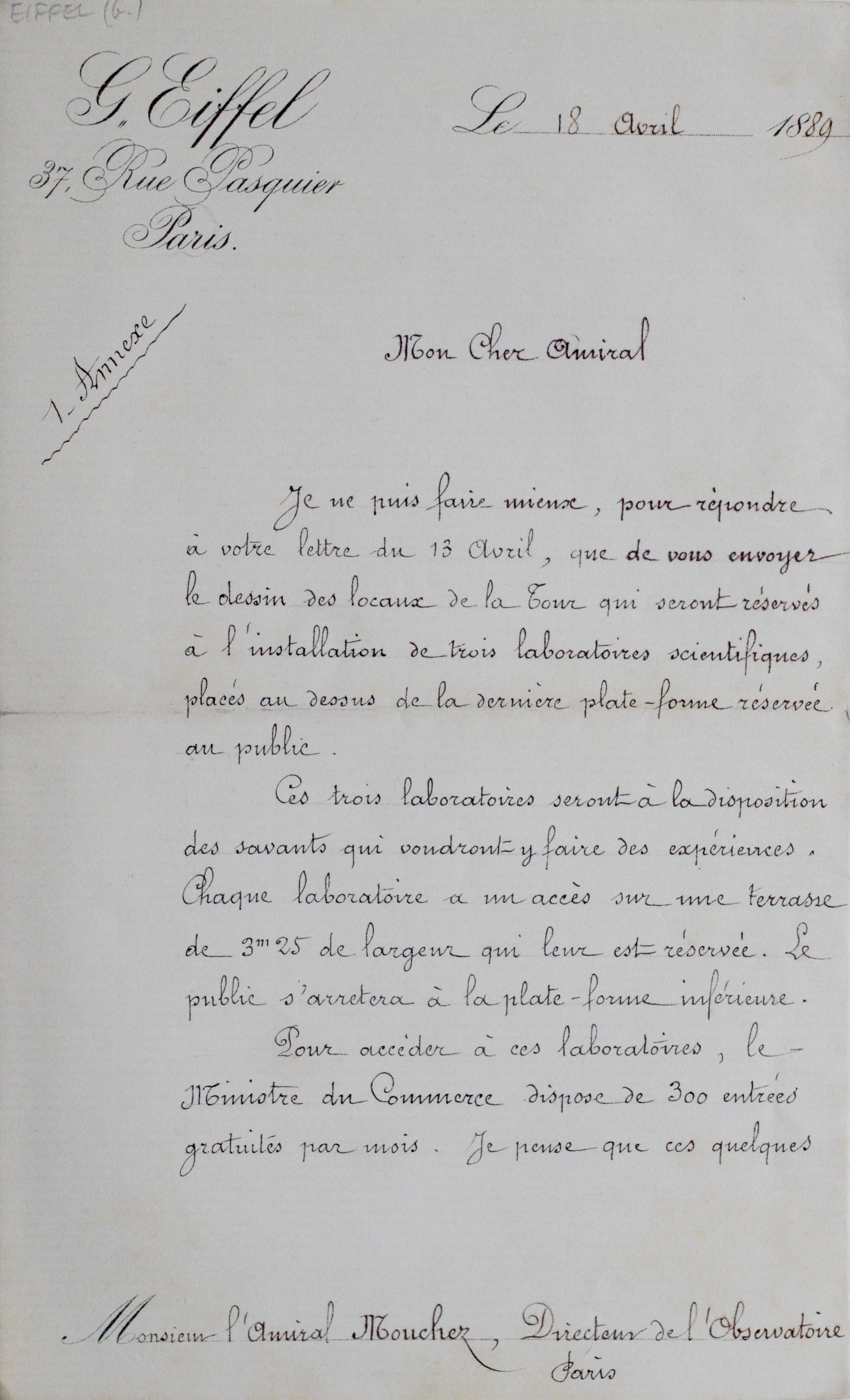 Superbe lettre de Gustave Eiffel, adressée à l'astronome Ernest Mouchez, alors directeur de l'Observatoire de Paris : "Je ne puis faire mieux, pour répondre à votre lettre du 13 avril, que de vous envoyer le dessin des locaux de la Tour qui seront réservés à l'installation de trois laboratoires scientifiques, placés au dessous de la dernière plate-forme réservée au public. Ces trois laboratoires seront à la disposition des savants qui voudront y faire des expériences. Chaque laboratoire a un accès sur une terrasse de 3m25 de largeur qui leur est réservé. Le public s'arrêtera à la plate forme inférieure. Pour accéder à ces laboratoires, le Ministre du Commerce dispose de 300 entrées gratuites par mois [...]. Je serais heureux de voir vos prévisions se réaliser, et l'Observatoire de Paris, tirer profit de l'édification de la Tour [...]".