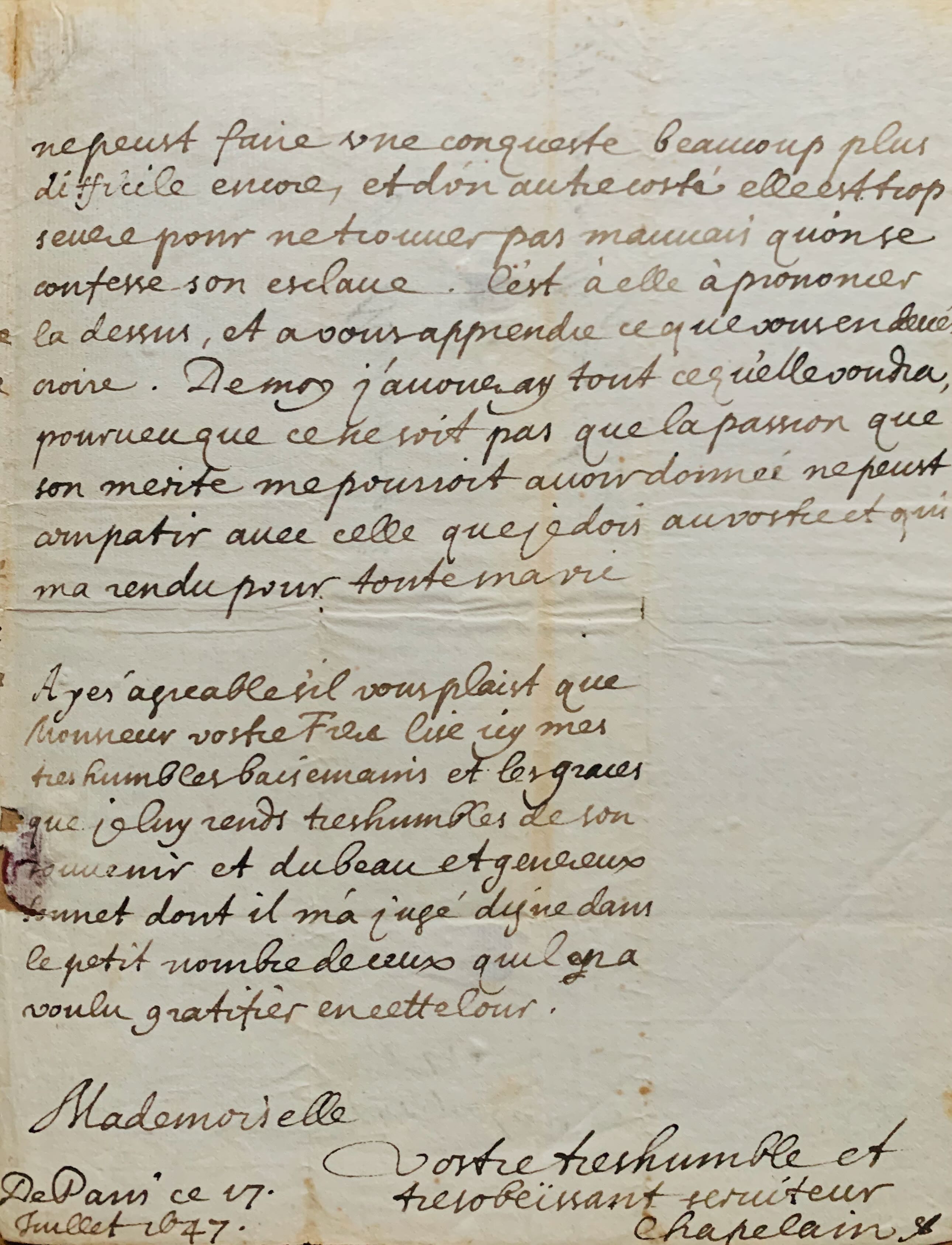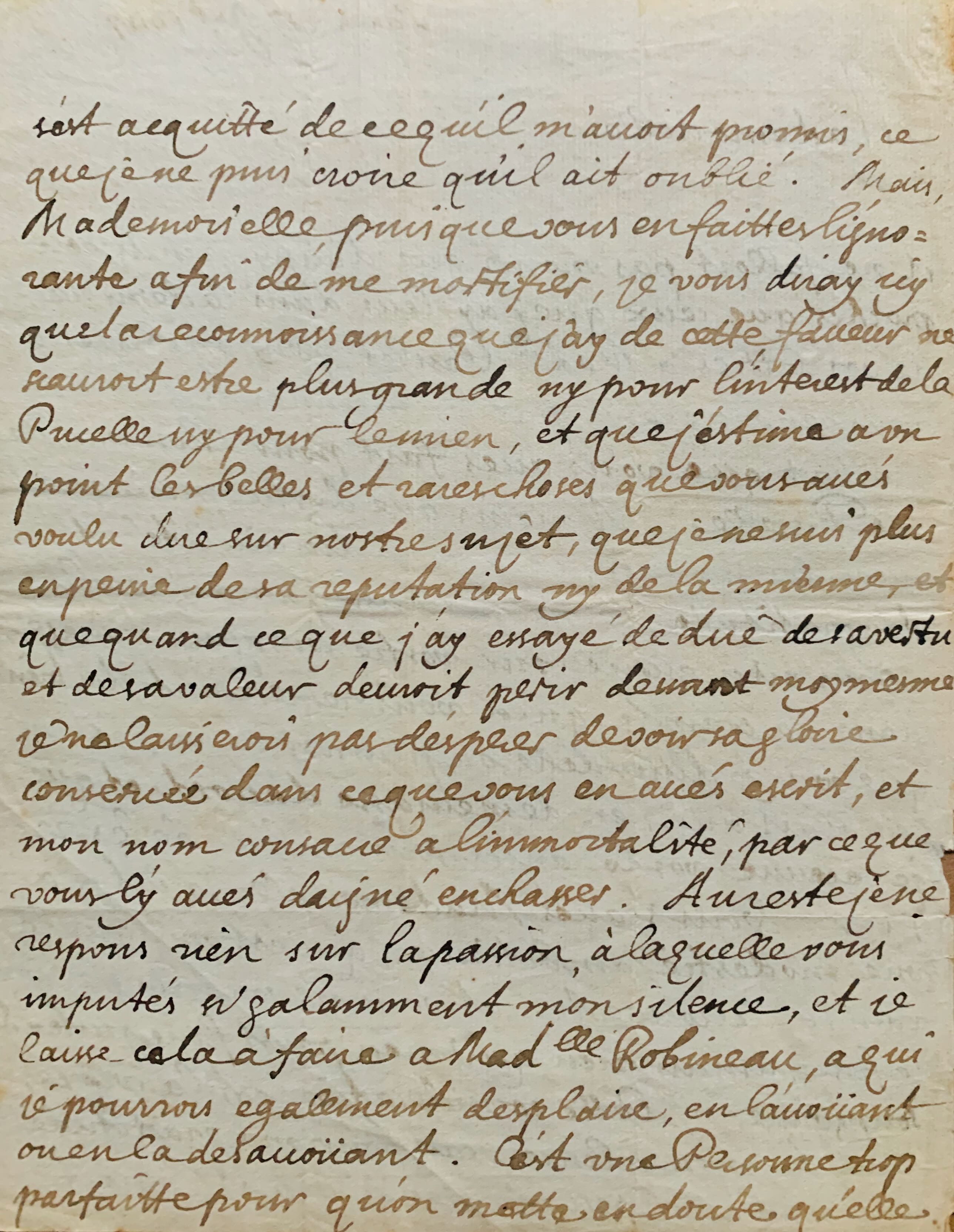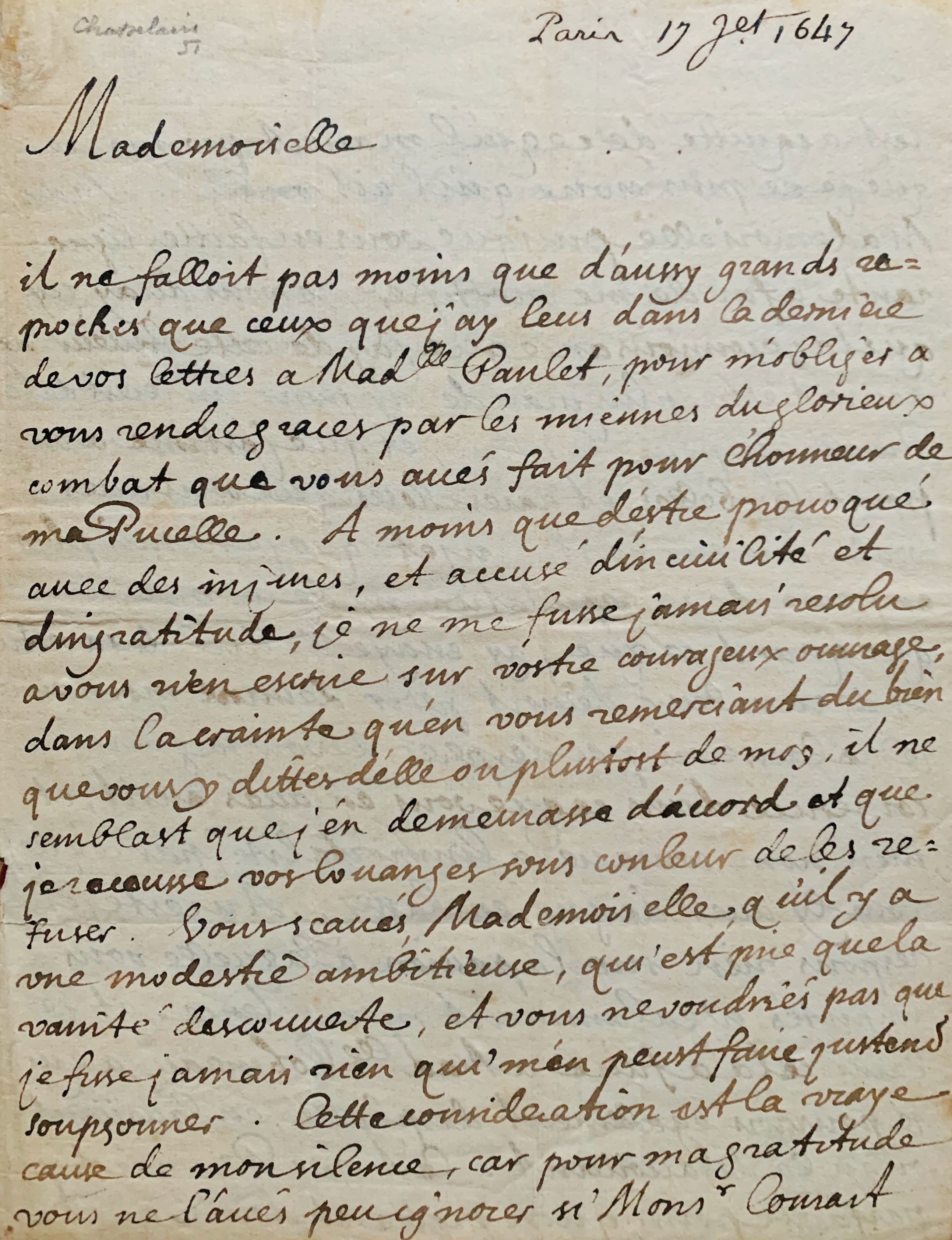 « Il ne falloit pas moins que d'aussy grands reproches que ceux que j'ay leus dans la derniere de vos lettres a Madlle Paulet, pour m'obliger a vous rendre graces par les miennes du glorieux combat que vous avés fait pour l'honneur de ma Pucelle. A moins que d'estre provoqué avec des injures, et accusé d'incivilité et d'ingratitude, je ne me fusse jamais resolu à vous rien escrire sur vostre courageux ouvrage, dans la crainte qu'en vous remerciant du bien que vous y dittes d'elle ou plustost de moy, il ne semblast que j'en demeurasse d'accord et que je receusse vos louanges sous couleur de les refuser. Vous scavés, Mademoiselle, qu'il y a une modestie ambitieuse, qui est pire que la vanité descouverte, et vous ne voudriés pas que je fisse jamais rien qui m'en peust faire justement soupçonner. Cette consideration est la vraye cause de mon silence, car pour ma gratitude vous ne l'avés peu ignorer si Monsr Conrart s'est acquitté de ce qu'il m'avoit promis, ce que je ne puis croire qu'il ait oublié. Mais, Mademoiselle, puisque vous en faittes l'ignorante afin de me mortifier, je vous diray icy que la reconnoissance que j'ay de cette faveur ne scauroit estre plus grande ny pour l'interest de la Pucelle ny pour le mien, et que j'estime a un point les belles et rares choses que vous avés voulu dire sur nostre sujet, que je ne suis plus en peine de sa reputation ny de la mienne, et que quand ce que j'ay essayé de dire de sa vertu et de sa valeur devroit perir devant moy mesme je ne laisserois pas d'esperer de voir sa gloire conservée dans ce que vous en avés escrit, et mon nom consacré à l'immortalité, par ce que vous l'y avés daigné enchasser. Au reste je ne respons rien sur la passion, à laquelle vous imputés si galamment mon silence, et je laisse cela à faire à Madlle Robineau, a qui je pourrois egallement desplaire, en l'avoüant ou en la desavoüant. C'est une Personne trop parfaitte pour qu'on mette en doute qu'elle ne peust faire une conqueste beaucoup plus difficile encore, et d'un autre costé elle est trop severe pour ne trouver pas mauvais qu'on se confesse son esclave ». Jean Chapelain termine en remerciant le frère de sa correspondante (l'académicien Georges de Scudéry) « de son souvenir et du beau et genereux sonnet dont il m'a jugé digne dans le petit nombre de ceux quil en a voulu gratifier en cette Cour ».
