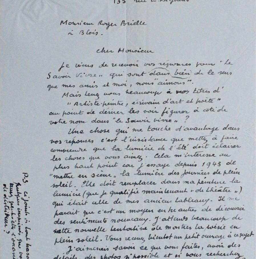"[...] tenez-vous beaucoup à vos titre d'"artiste-peintre, écrivain d'art et poète" au point de désirer les voir figurer à côté de votre nom dans "Le Savoir vivre" ? Une chose qui me touche d'avantage dans vos réponses c'est l'insistance que [vous] mettez à faire comprendre que la lumière de l'été doit éclairer les choses que vous aimez. Cela m'intéresse au plus haut point car j'essaye depuis 1943 de "mettre en scène" la lumière des journées de plein soleil. Elle doit remplacer dans ma peinture la lumière (que je qualifie maintenant "de théâtre") qui était celle de mes anciens tableaux [...]". Cela permet, selon lui, de découvrir des sentiments nouveaux. Il ajoute "J'attends beaucoup de cette nouvelle tentative de montrer la poésie en plein soleil. Vous recevrez bientôt un petit ouvrage à ce sujet [...]". Magritte réclame des détails et photos des recherches de son correspondant et joint des prospectus à distribuer.