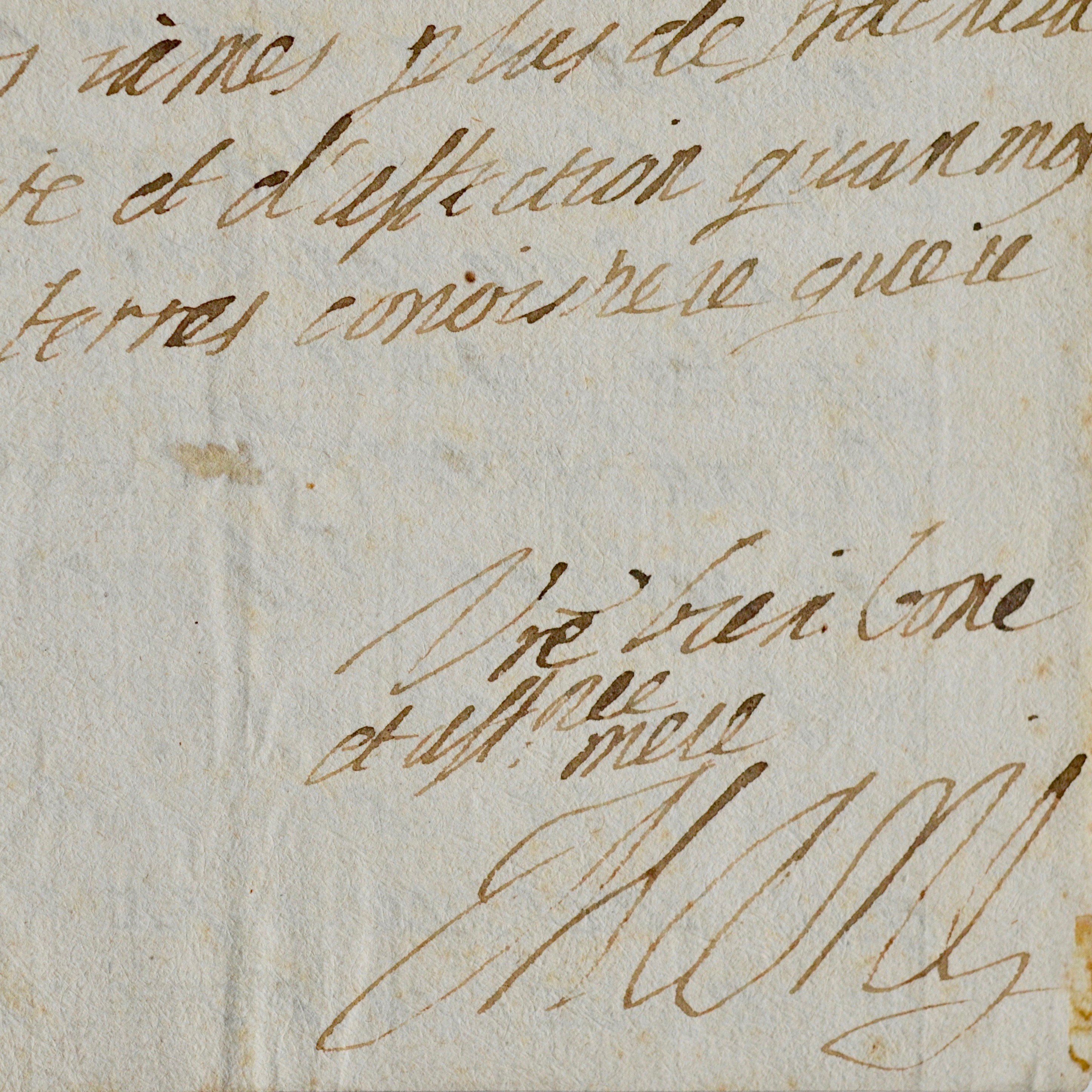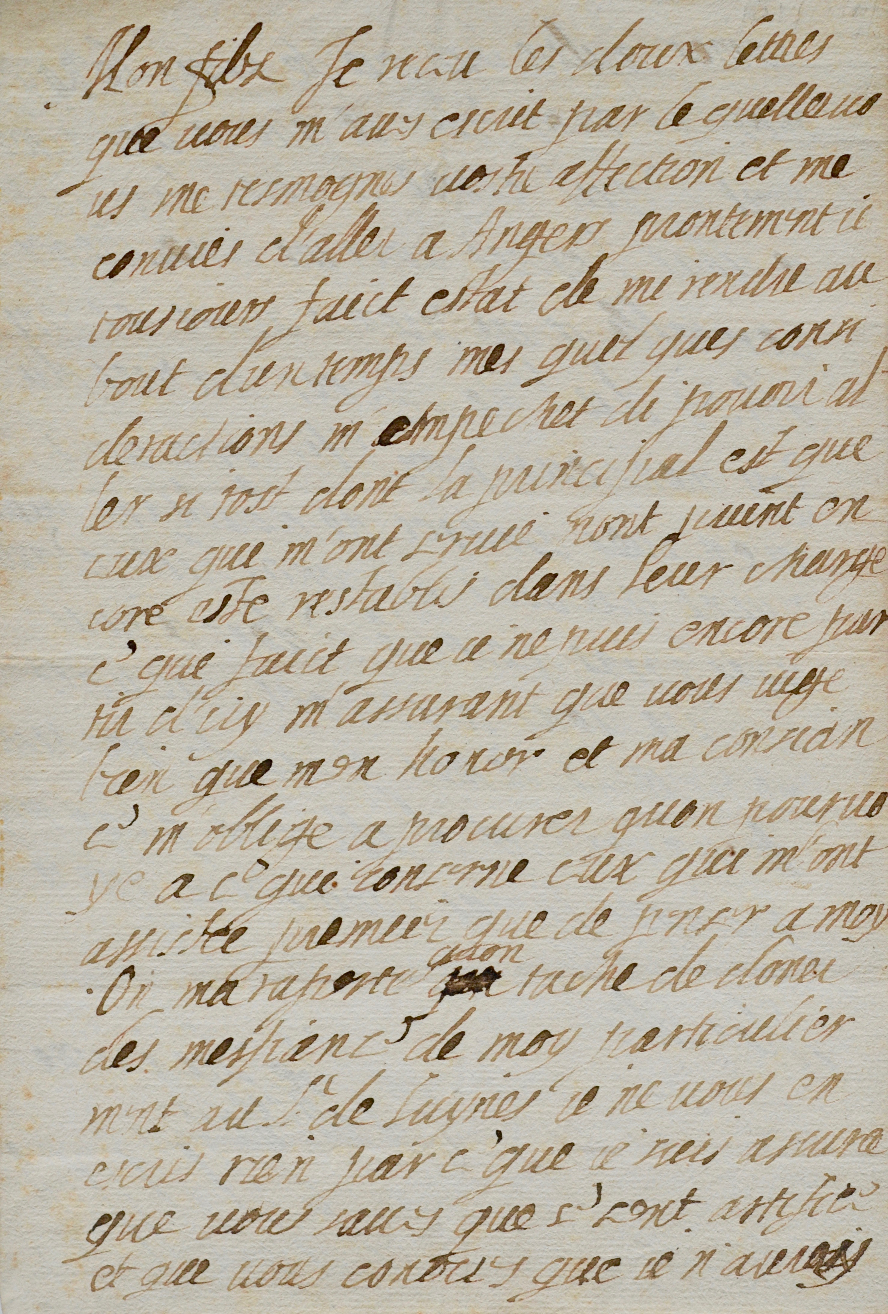 Elle a reçu ses lettres «par lesquelles vous me tesmoignes vostre affection et me convies daller a Angers prontement». Elle a été retenue car «ceux qui mont servie nont puint encore este restablis dans leur charge [...] je ne puis encore partir dicy massurant que vous jugez bien que mon honor et ma consiance moblige a procurer quon pourvoye a ce qui concerne ceux qui mont assistee premier que de penser a moy. On ma raporte quon tache de doner des mesfiance de moy particulierement au Sr de Luynes [...] vous saves que se sont artifice [...] vous conteres que je nauray james aultre but que de servir le Roy monsieur mon filz et que je vos aimer tout ce quil aimet je vous lay dict je vous lescris vous me conoistreres veritable je me promes aussi les bons offices du Sr de Luynes aupres du Roy monsieur mon filz comme vous men aves assuree ne doubtant puint que vous ny contribuiés ce quil vous seras possible [...]».