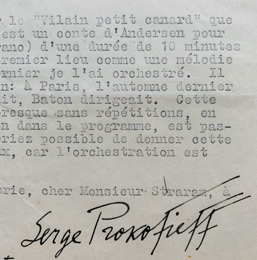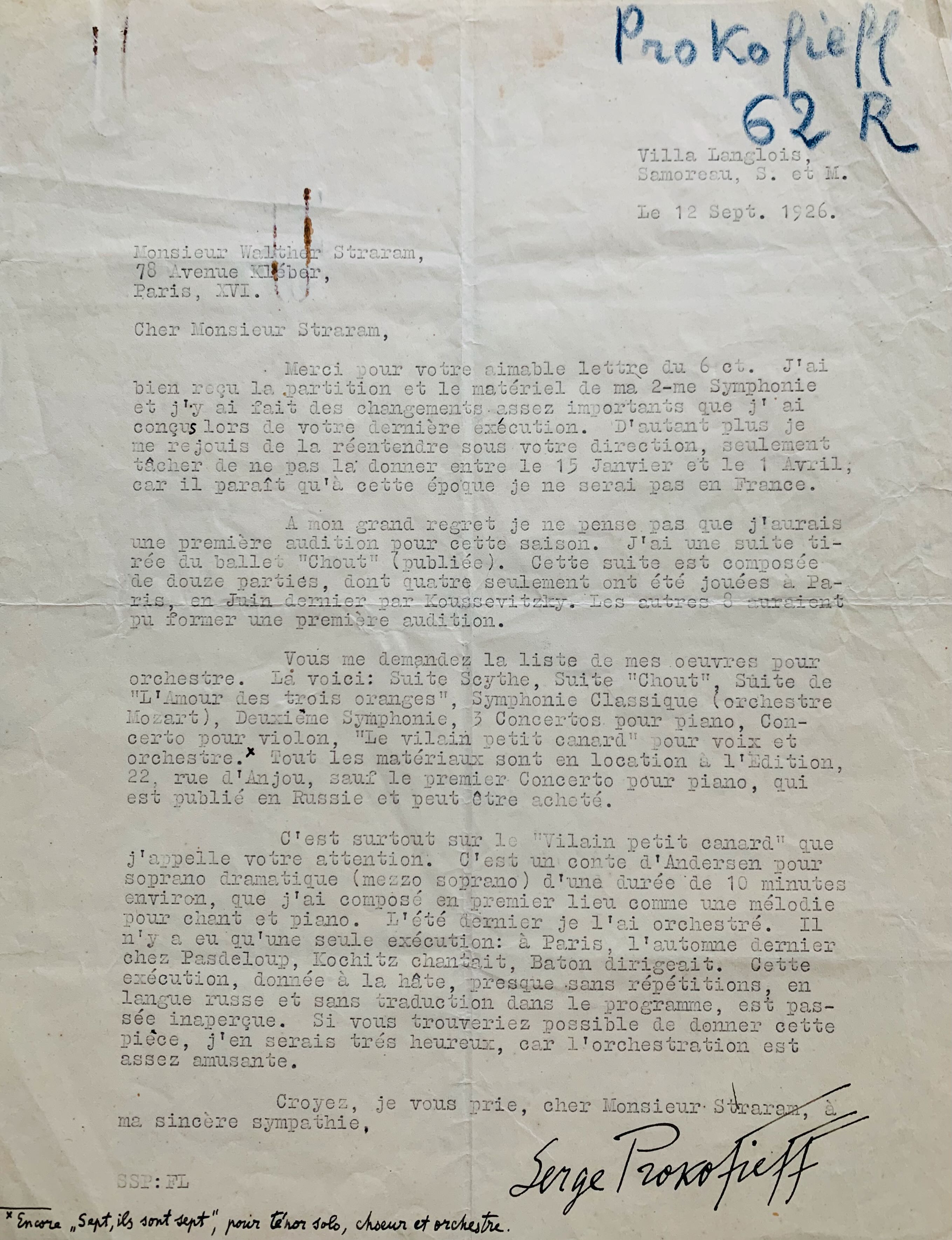 "J'ai bien reçu la partition et le matériel de ma 2ème symphonie et j'y ai fait des changements assez importants que j'ai conçus lors de votre dernière exécution. D'autant plus, je me réjouis de la réentendre sous votre direction, seulement tâcher de ne pas la donner entre le 15 janvier et le 1 avril, car il parait qu'à cette époque je ne serai pas en France". Il regrette de na pas avoir une première audition programmée pour la saison. "J'ai une suite tirée du ballet "Chout" (publiée). Cette suite est composée de douze parties, dont quatre seulement ont été jouées à Paris, en juin dernier par Koussevitsky. Les autres 8 auraient pu former une première audition". A la demande de Walther Straram, il dresse la liste de ses oeuvres : "Suite Scythe, Suite "Chout", Suite de "l'Amour des trois oranges", Symphonie Classique (orchestre Mozart), Deuxième symphonie, 3 concertos pour piano, Concerto pour violon, "Le vilain petit canard" pour voix et orchestre". Il ajoute de sa main : "Encore, "sept, ils sont sept, pour ténor solo, choeur et orchestre", et précise : "Tous les matériaux sont en location à l'édition, 22 rue d'Anjou, sauf le premier concerto pour piano, qui est publié en Russie et peut être acheté". Il insiste. "C'est surtout sur le "Vilain petit canard" que j'appelle votre attention. C'est un conte d'Andersen pour soprano dramatique (mezzo soprano) d'une durée de 10 minutes environ, que j'ai composé en premier lieu comme une mélodie pour chant et piano. L'été dernier, je l'ai orchestré. Il n'y a pas eu qu'une seule exécution : à Paris, à l'automne dernier chez Pasdeloup, Kochitz chantait, Baton dirigeait. Cette exécution donnée à la hâte, presque sans répétitions, en langue russe et sans traduction dans le programme, est passée inaperçue. Si vous trouveriez possible de donner cette pièce, j'en serais très heureux, car l'orchestration est assez amusante".