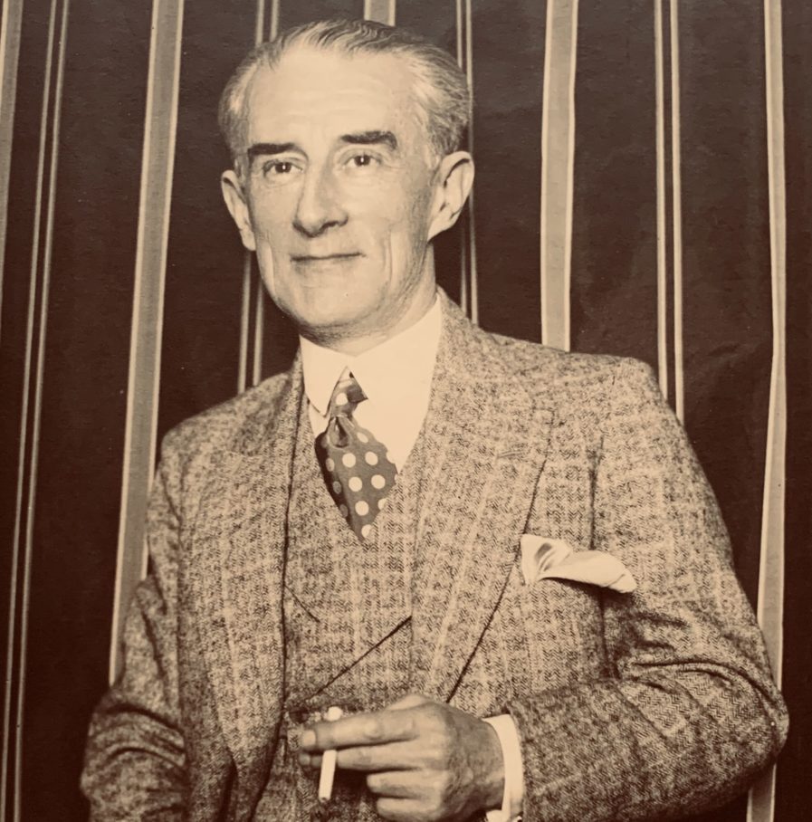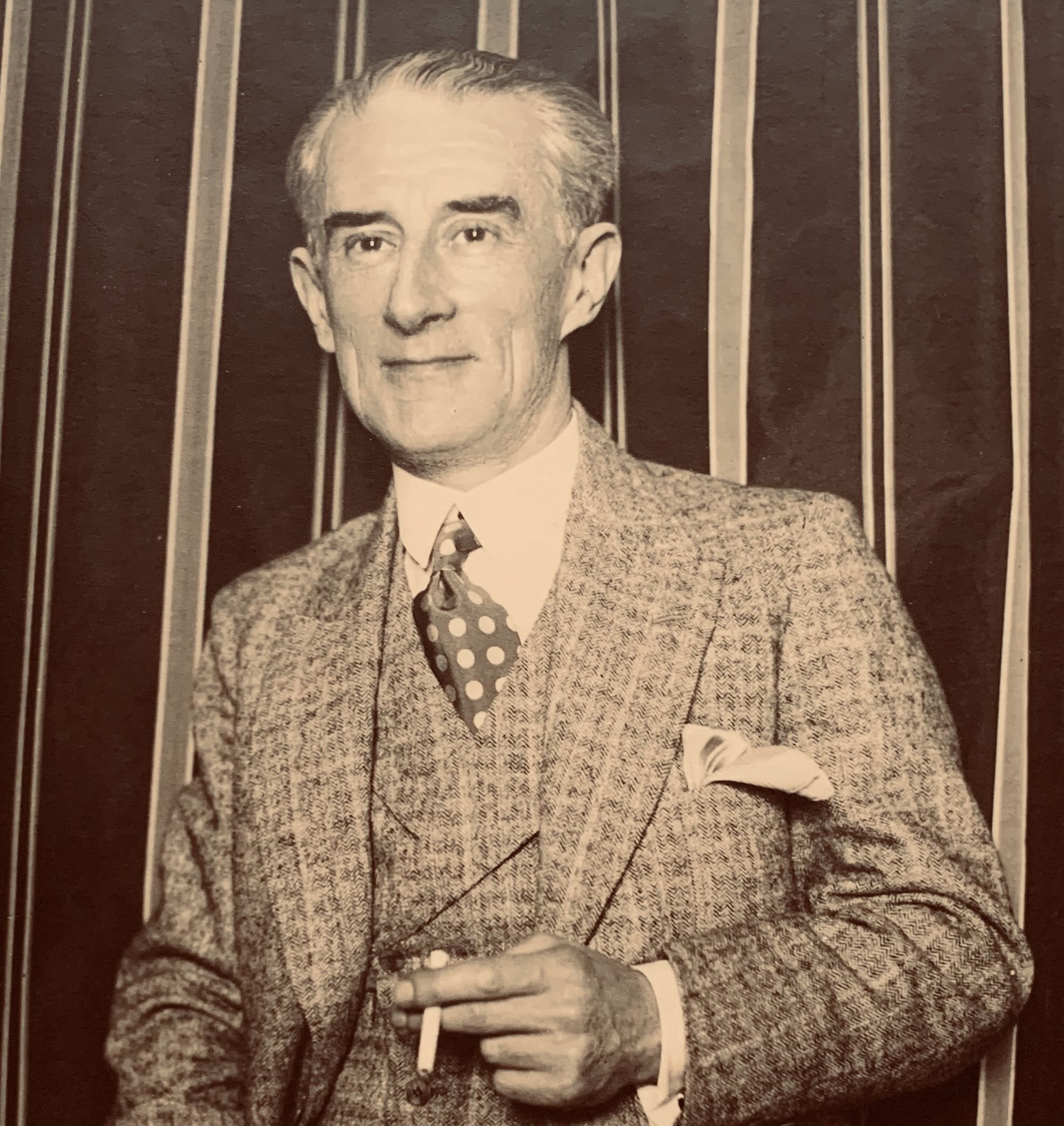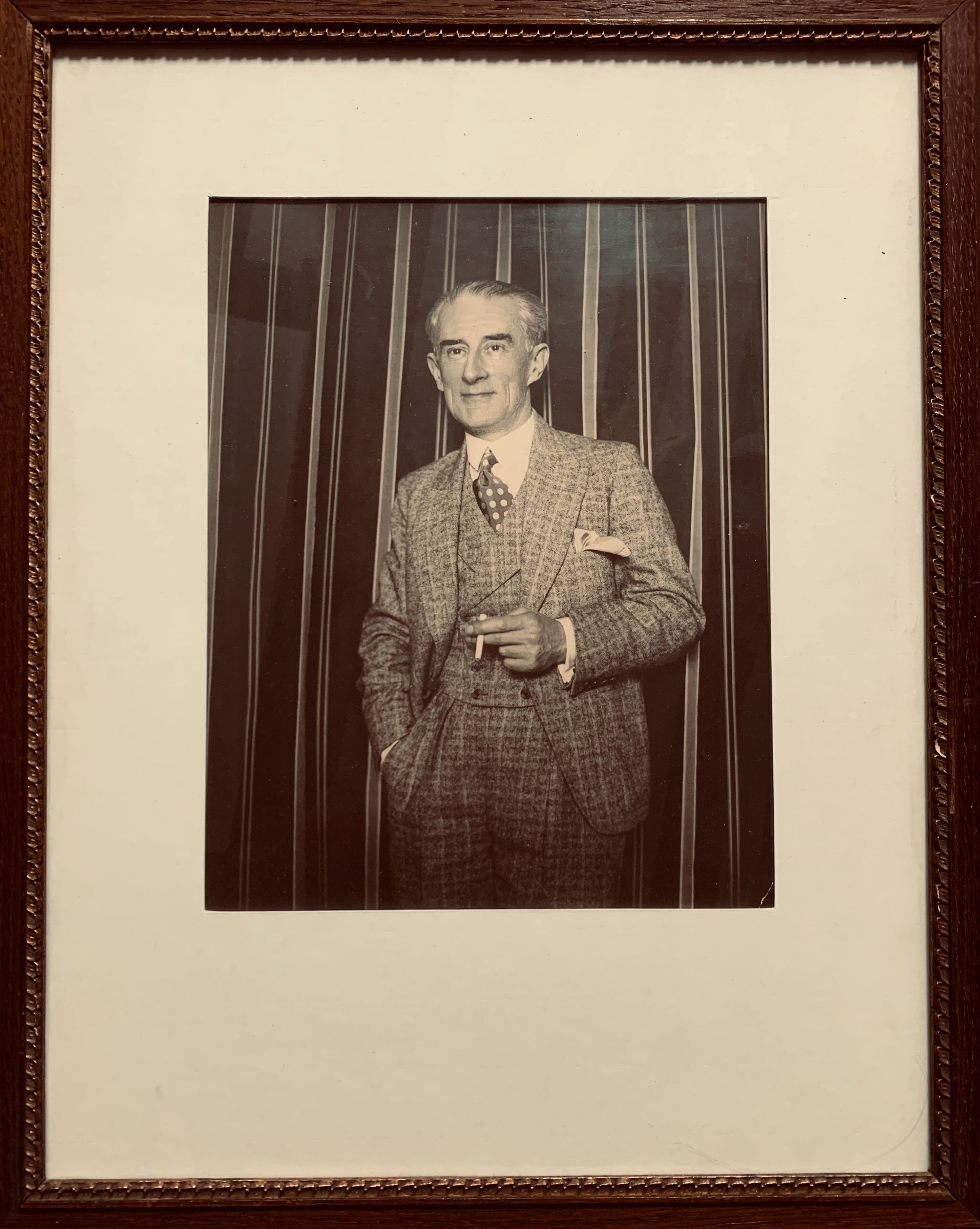 Superbe portrait photographique de Maurice Ravel, très élégant, en smoking, cigarette à la main.