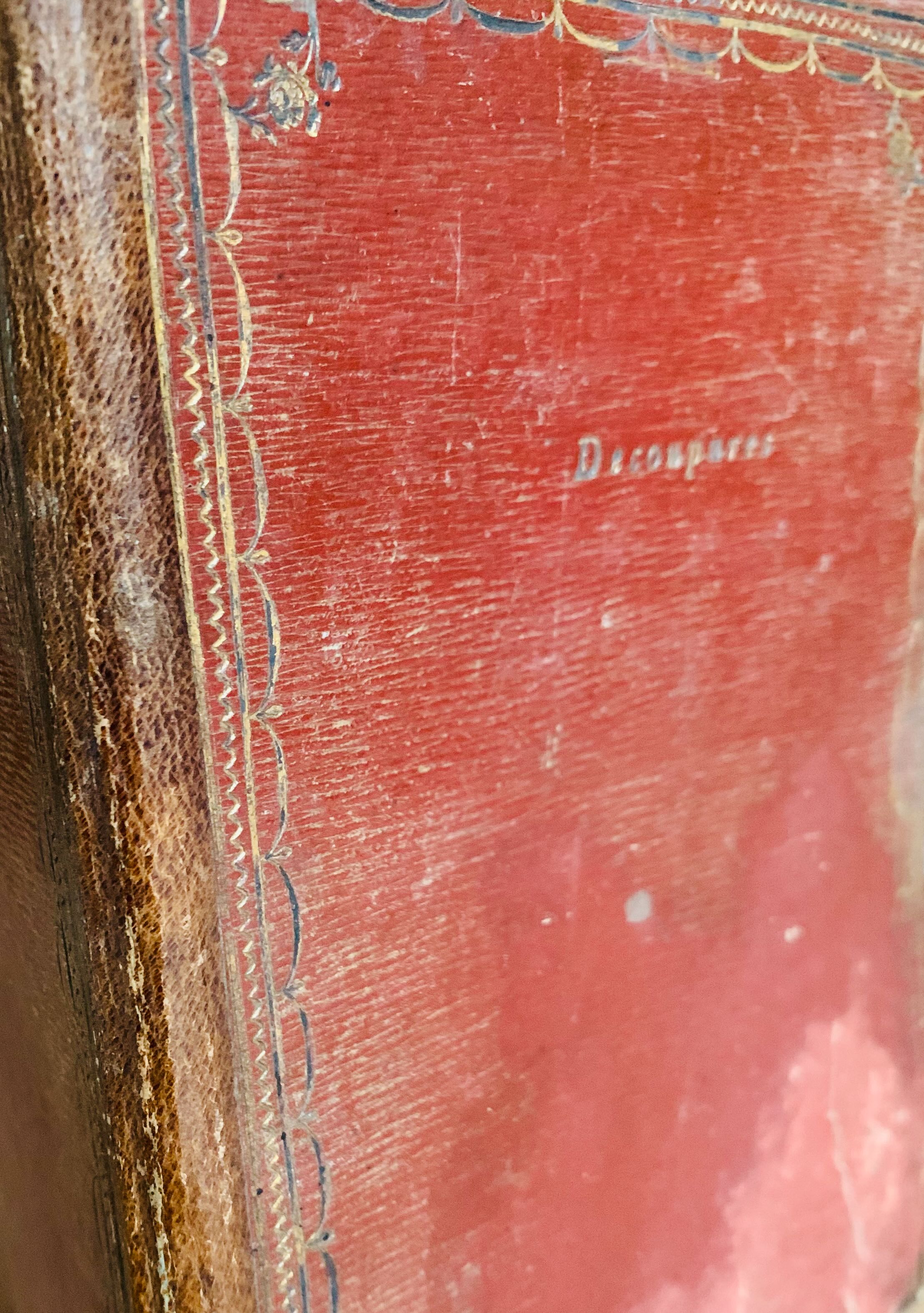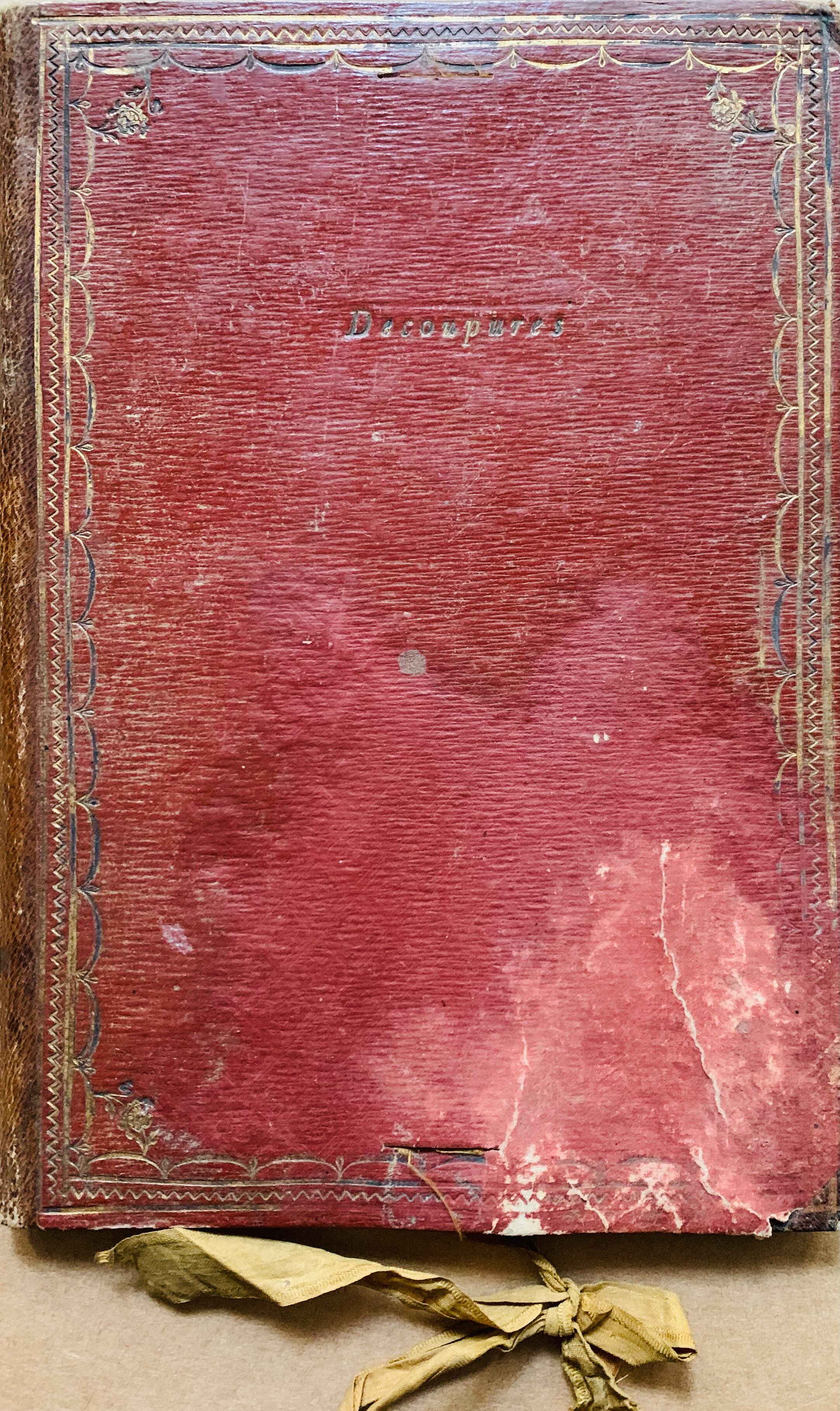 Le tout est conservé dans un étui en maroquin rouge à longs grains, titre en lettres dorées sur le plat "Découpures", filets d'encadrement, ruban de fermeture (1 sur 2) ; mouillure affectant l'étui en coin inférieur droit.