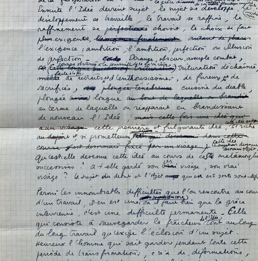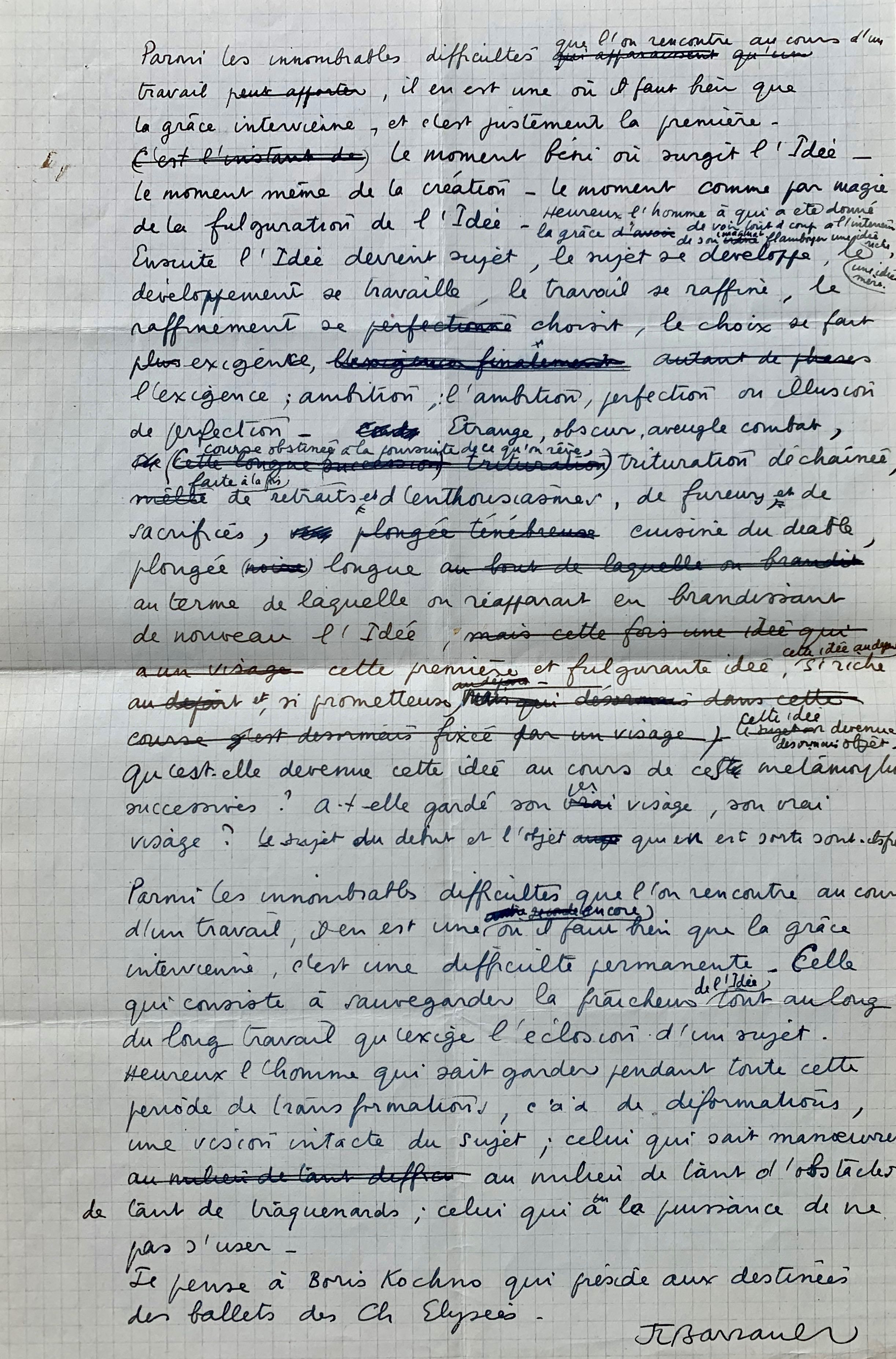 "Parmi les innombrables difficultés que l'on rencontre au cours d'un travail, il en est une où il faut bien que la grâce intervienne, et c'est justement la première. Le moment béni où surgit l'Idée. Le moment même de la création. Le moment comme par magie de la fulguration de l'Idée. Heureux l'homme à qui a été donné la grâce de voir tout à coup à l'intérieur de son imagination, flamboyer une idée riche, une idée mère. Ensuite l'Idée devient sujet, le sujet se développe, le développement se travaille, le travail se raffine, le raffinement se choisit, le choix se fait exigence, l'exigence ambition, l'ambition perfection ou illusion de perfection. Etrange, obscur, aveugle combat, course obstinée à la poursuite de ce qu'on rêve, trituration déchaînée [...]". La difficulté permanente, c'est "celle qui consiste à sauvegarder la fraîcheur de l'Idée tout au long du long travail qu'exige l'éclosion d'un sujet. Heureux l'homme qui sait garder pendant toute cette période de transformations, c'est à dire de déformations, une vision intacte du sujet ; celui qui sait manoeuvrer au milieu de tant d'obstacles, de tant de traquenards ; celui qui a la puissance de ne pas s'user. Je pense à Boris Kochno qui préside aux destinées des ballets des Ch. Elysées".