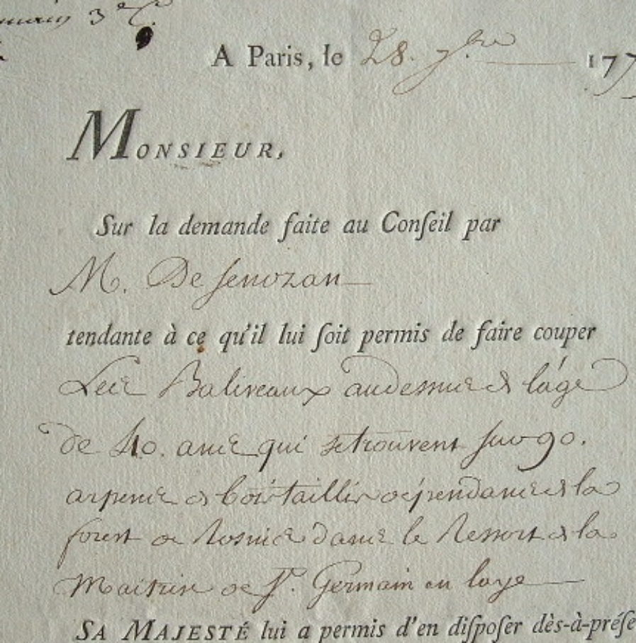 Description : Autorisation faite au grand-maître des eaux et forêt Duvaucel d'organiser des tailles dans la forêt de Rosnier, à Saint-Germain-en-Laye, à la demande de M. Senozan. Signée par de Beaumont.