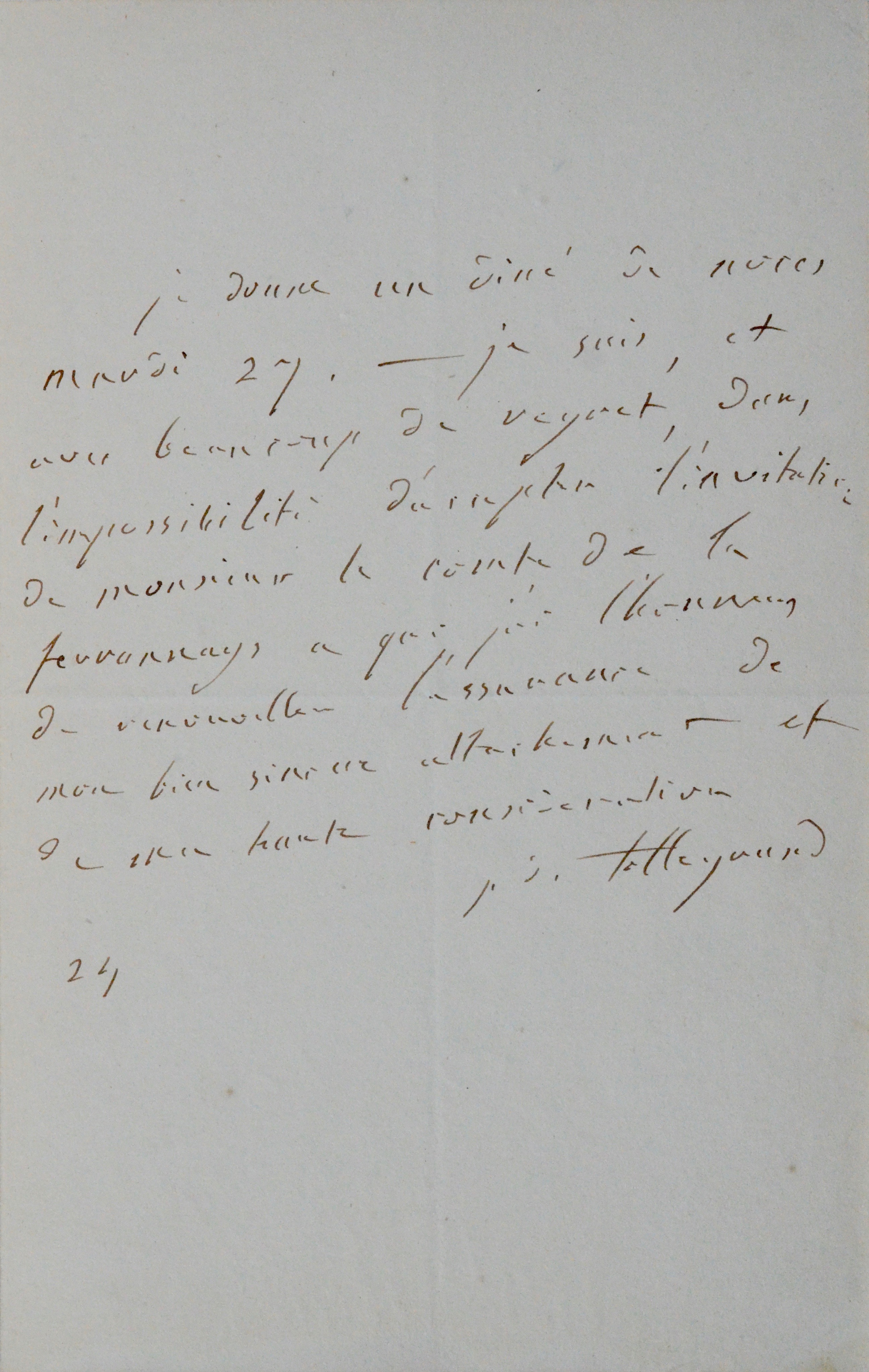 « Je donne un diné de noces mardi 27. - je suis, et avec beaucoup de regret, dans l’impossibilité d’accepter l’invitation de Monsieur le Comte de La Ferronnays à qui j’ai l’honneur de renouveler l’assurance de mon sincère attachement et de ma haute considération ».