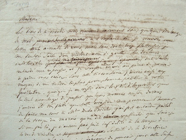François Joseph Talma (Paris, 1763/1826)Brouillon d'une belle lettre de Talma sur le théâtre et les souffrances que lui inflige la goutte. «Les biens de ce monde nous viennent rarement sans quelque mélange de mal. A l'instant où je recevais une lettre toute aimable de vous, mais sans doute trop flatteuse, je me sentais saisi d'un violent accès de goutte. Les douleurs intolérables qu'elle m'a fait éprouver ont seules retardé ma réponse et je souffre encore au point de ne pouvoir à peine vous écrire». Il la remercie infiniment de son invitation à venir à Angervilliers où il aurait eu le plaisir de faire sa cour à madame de La Brèche, mais son état de santé l'en empêche. «J'ai fort entendu parler de la troupe du marais qu'on m'a dit excellente. Que sais-je si une fois là, je n'aurois pas fait infidélité à la troupe de la rue de Richelieu, et sollicité par la directrice un ordre de début? Mais je désespère de pouvoir jouir cette saison de tout le plaisir que vous m'offrez. Je crains de rester encore longtemps boiteux, et en vérité j'aurois honte de me montrer avec cette ridicule infirmité. Nous autres princes, qui ne sont considérés qu'autant que nous marchons droit, il faut bien nous garder de clocher devant le monde. Il n'y a rien d'idéal dans la goutte, et aller ainsi clopin-clopant défigure furieusement un héros qu'on est habitué à ne voir que dans les régions poétiques. Quand je serai remis sur mes deux pieds, ce sera encore pis. Je suis harcelé par des auteurs en répétition ou près d'y être et qui gémissent au moins autant du retard que j'apporte à leurs pièces que des douleurs que j'éprouve. Il faudra réparer les jours perdus ; dès que je serai en état de reprendre mon service, on sera après moi, il faudra répéter tous les jours et jouer trois fois par semaine [...]. Heureux vos voisins qui ne sont sur le théâtre que quand la fantaisie leur en prend. Pourquoi mon étoile m'a-t-elle voulu rue de Richelieu, plutôt qu'au marais ; oui pourquoi Brunoy [lieu de sa résidence] n'est-il pas à côté d'Angervilliers! [...]». [La destinataire de la lettre est peut-être madame Récamier qui vivait à Angervilliers ; elle avait rencontré l'acteur le plus célèbre de son temps chez Mme de Stael et l'avait revu à plusieurs reprises].