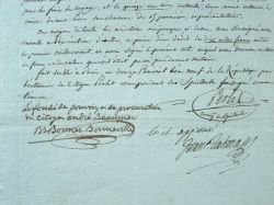 François Joseph Talma (Paris, 1763/1826)Contrat d'engagement de Talma et son épouse Caroline Vanhove par le Grand Théâtre de Marseille, pour "quinze représentations au moins et vingt au plus". Les conditions d'engagement et de rémunération sont définies en 7 articles. «[...]. Primo, il sera payé au citoyen Talma et Dame Vanhove la somme de neuf cens livres tournois pour tous les frais quelconques de leurs voyages et pour le transport de leurs équipages [...]. Secondo, chaque soir après la représentation finie, il leur sera compté, dans leur loge, la somme de sept cens livres pour leurs honoraires convenus à chaque ditte représentation, cette somme servant aux émolumens des deux artistes. Tertio, il sera donné deux représentations aux bénéfices [...]». Le document est signé par Talma qui l'a "lu et approuvé", Perlet comme "correspondant des spectacles", et Bonnet-Bonneville comme agent des théâtres de Marseille, fondé de pouvoir et de procuration d'André Beaussier, propriétaire du théâtre du paillon et entrepreneur du Grand Théâtre de Marseille.