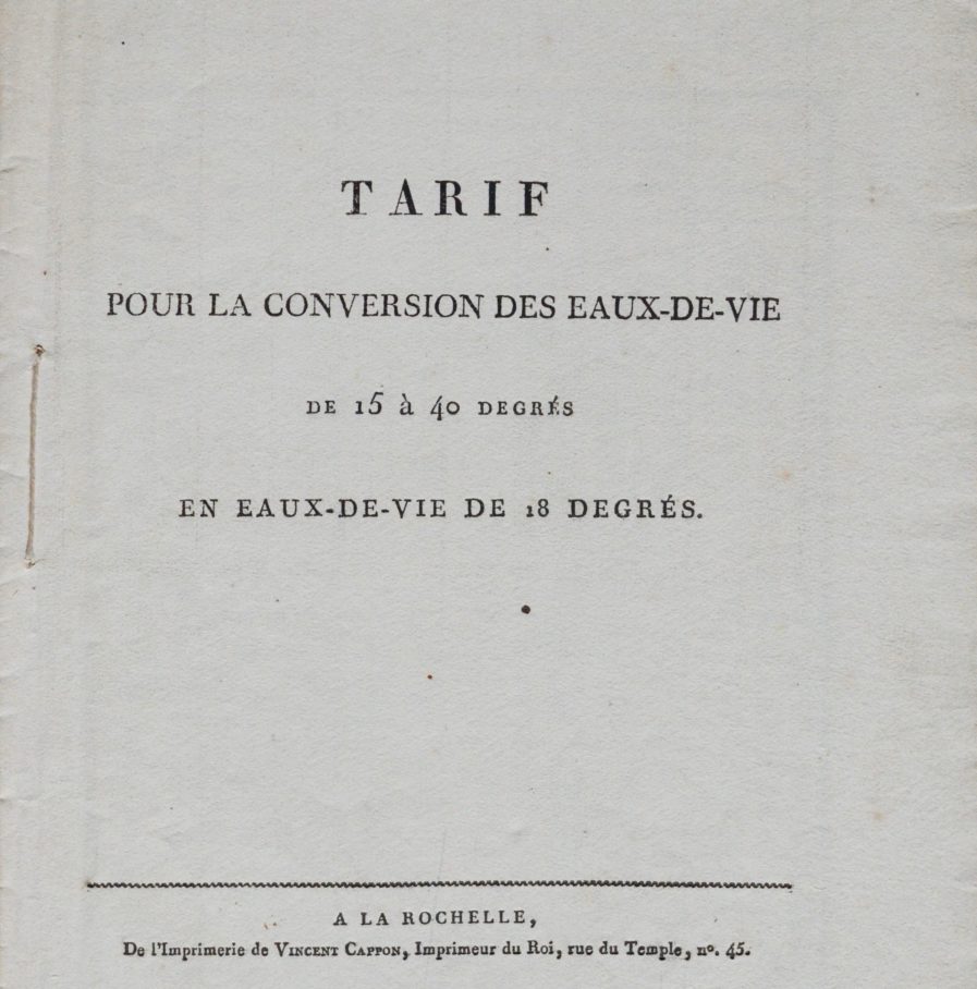 Imprimé de 10 pages intitulé : "Tarif pour la conversion des eaux-de-vie de 15 à 40 degrés en eau-de-vie de 18 degrés".