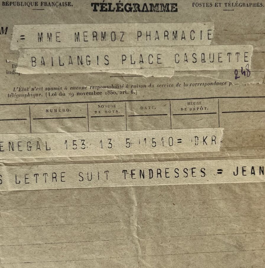 Télégramme de Jean Mermoz adressé à sa mère, de Saint-Louis du Sénégal : "Bien arrivés lettre suit tendresses. Jean".