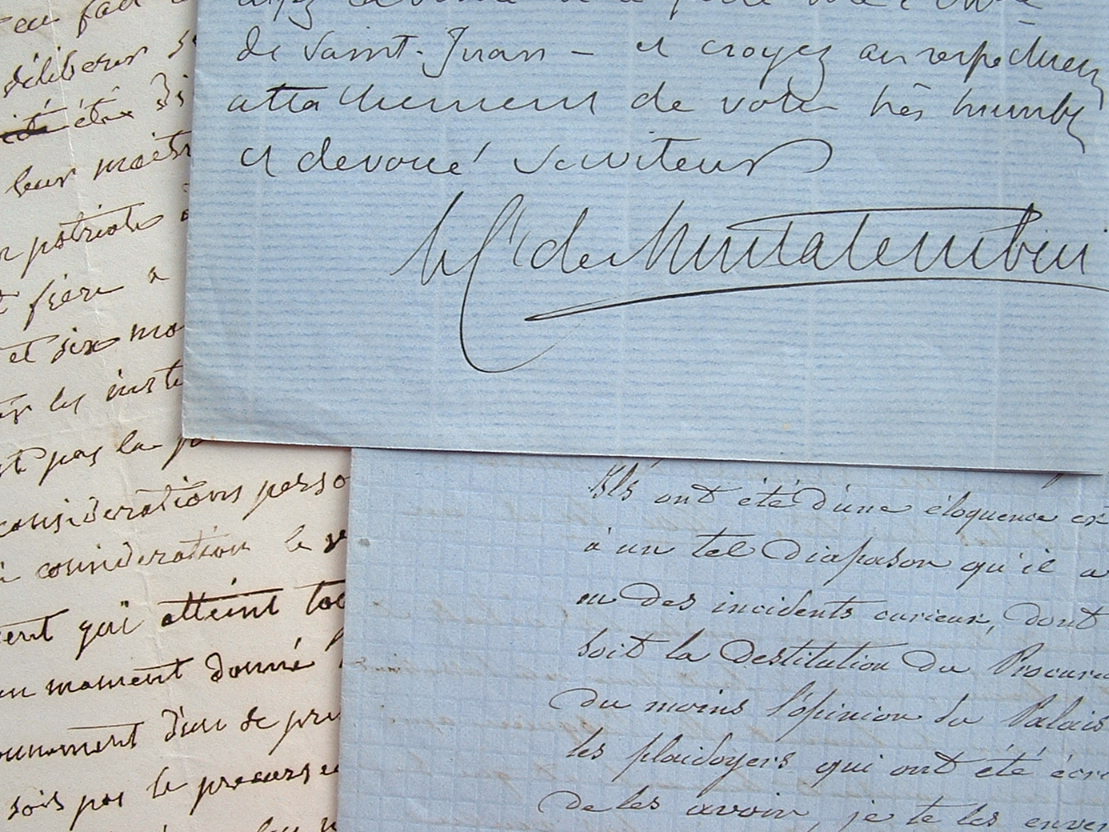 Charles Montalembert (comte de) (Londres, 1810/1870)Intéressant ensemble relatif au procès intenté contre Montalembert à la suite de la publication de l'article publié dans le Correspondant du 25 oct. 1858, dans lequel il critiquait la vie politique française ; accusé par le ministère public d'avoir «excité à la haine et au mépris du gouvernement, violé le respect dû aux lois et attaqué les droits et l'autorité que l'Empereur tient de la constitution et du suffrage universel», il est jugé le 25 nov. 1858 et condamné à 6 mois d'emprisonnement et 3000 f. d'amende. Trois documents manuscrits composent ce petit dossier : manuscrit d'un article de presse qui dit toute son indignation après le verdict ; copie d'époque "extrait d'une lettre" qui révèle la manière dont les débats se sont déroulés lors du procès et donne des extraits des plaidoieries de Berryer et Dufaure ; enfin une lettre de Montalembert qui adresse un exemplaire de la brochure des plaidoieries de Berryer et Dufaure. «L'orateur le plus éloquant de la France, l'un de ses enfants des plus honorables et des plus distingués, le Cte de Montalembert, a comparu devant quelques juges de police et après qu'ils ont eu fait la farce de rester une heure pour délibérer sur une sentence qui leur avait été dictée 15 jours auparavant par leur maître impérial ; un homme d'état, un patriote dont toute nation serait justement fière, a été condamné à 3000 f. d'amende et six mois de prison pour avoir osé vanter les institutions et le caractère anglais [...]». [Montalembert refusera la grâce accordée par l'Empereur, et le nouveau procès en appel réduira sa peine à 3 mois de prison].