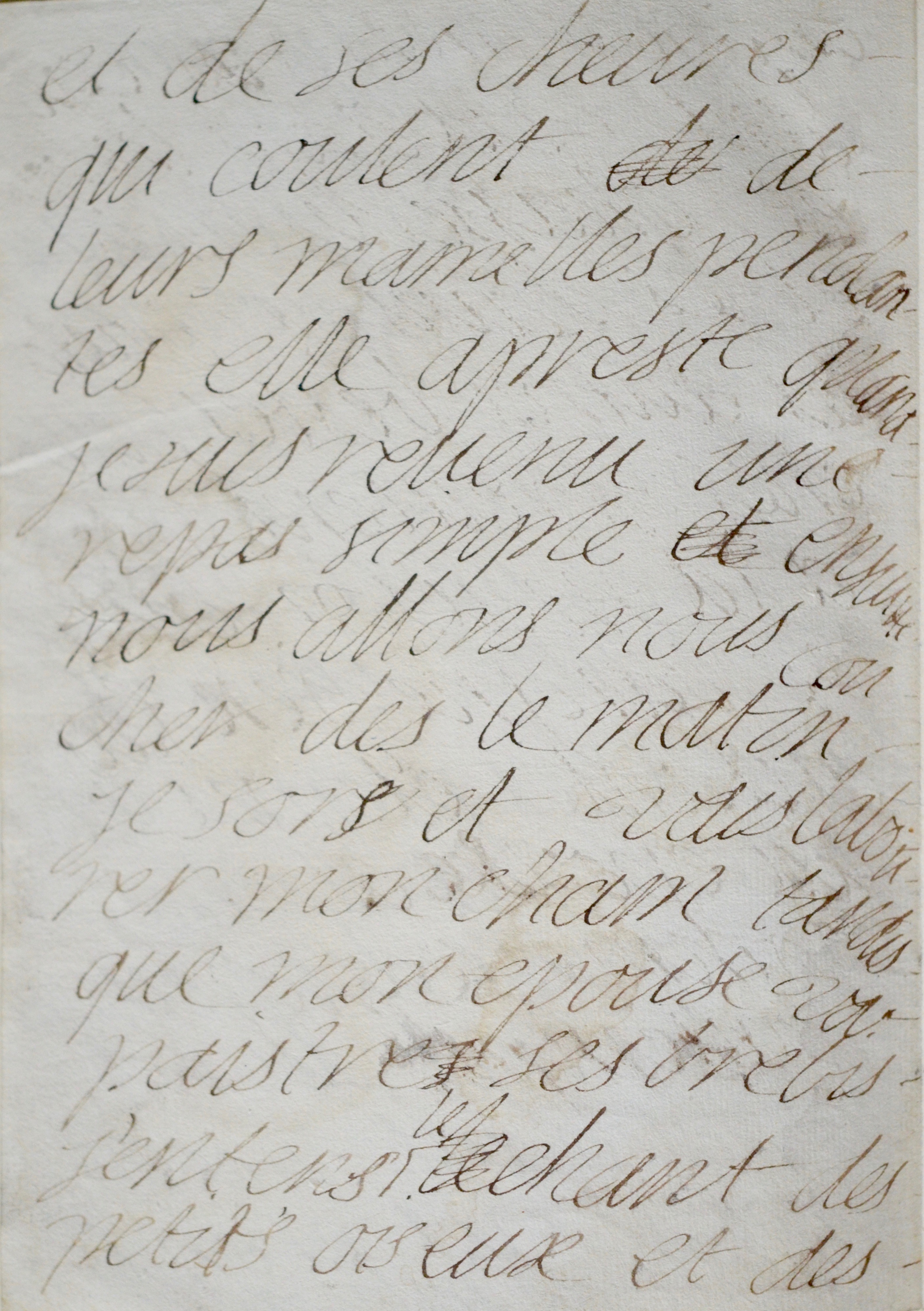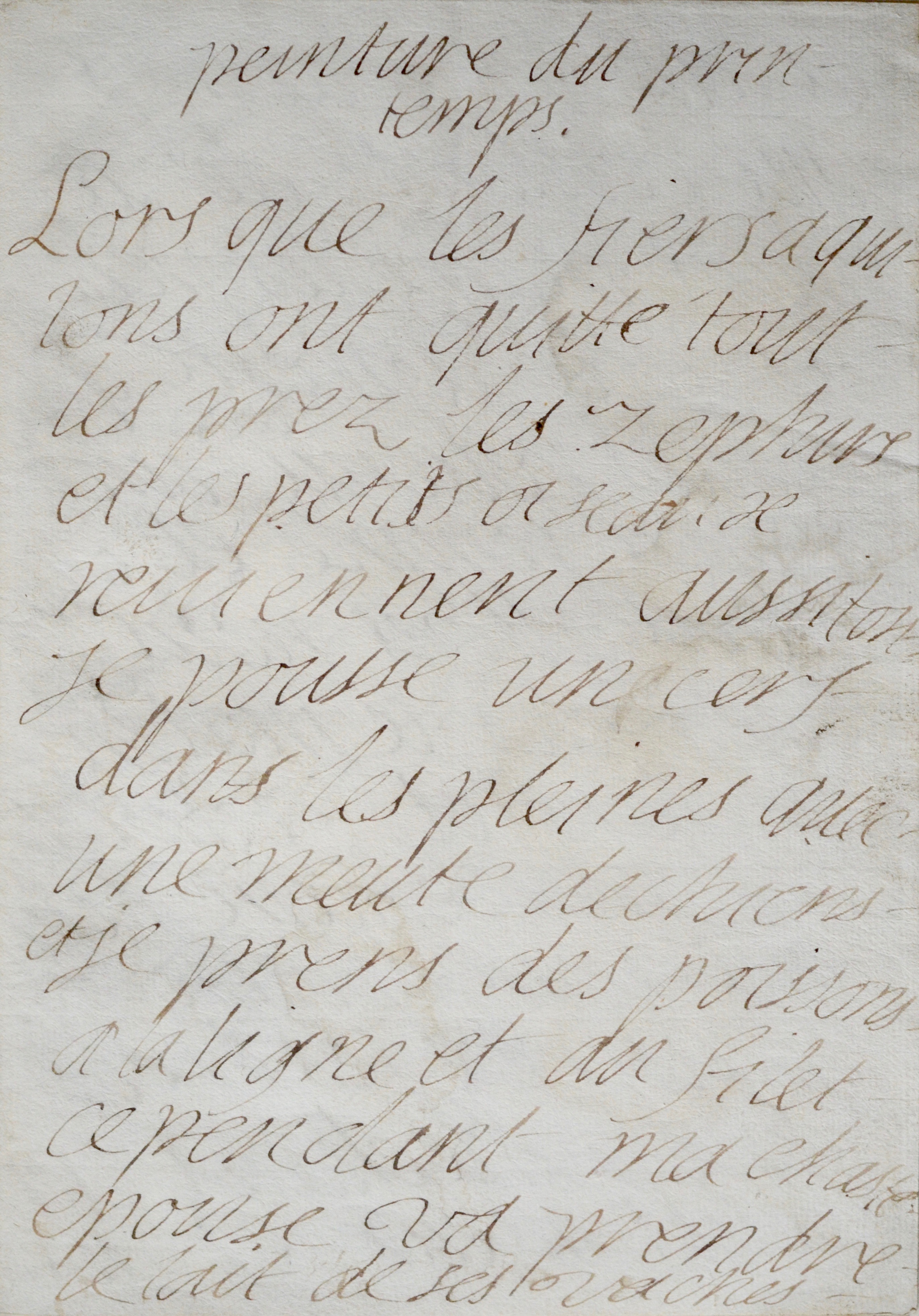 Lorsque les fiers aquilons ont quitté tout les prez les zéphyrs et les petits oiseaux reviennent aussitost. Je pousse un cerf dans les pleines avec une meute de chiens et je prens des poissons a la ligne et du filet. Cependant ma chaste epouse va prendre le lait de ses vaches et de ses chevres qui coulent de leurs mamelles pendantes elle apreste quand je suis revenu une [sic] repas simple ensuitte nous allons nous coucher des le matin je sors et vais labourer mon cham tandis que mon epouse voi piastre ses brebis. j'entens le chant des petits oiseux et des rossignols mon fils cependant va dans les bois et chasse les cerfs les dains et toutes les autres bestes farouches il revient fatiguer a la maison ou il se baigne j'en fais autant et mon epouse aussi voila comme je passe le printemps."