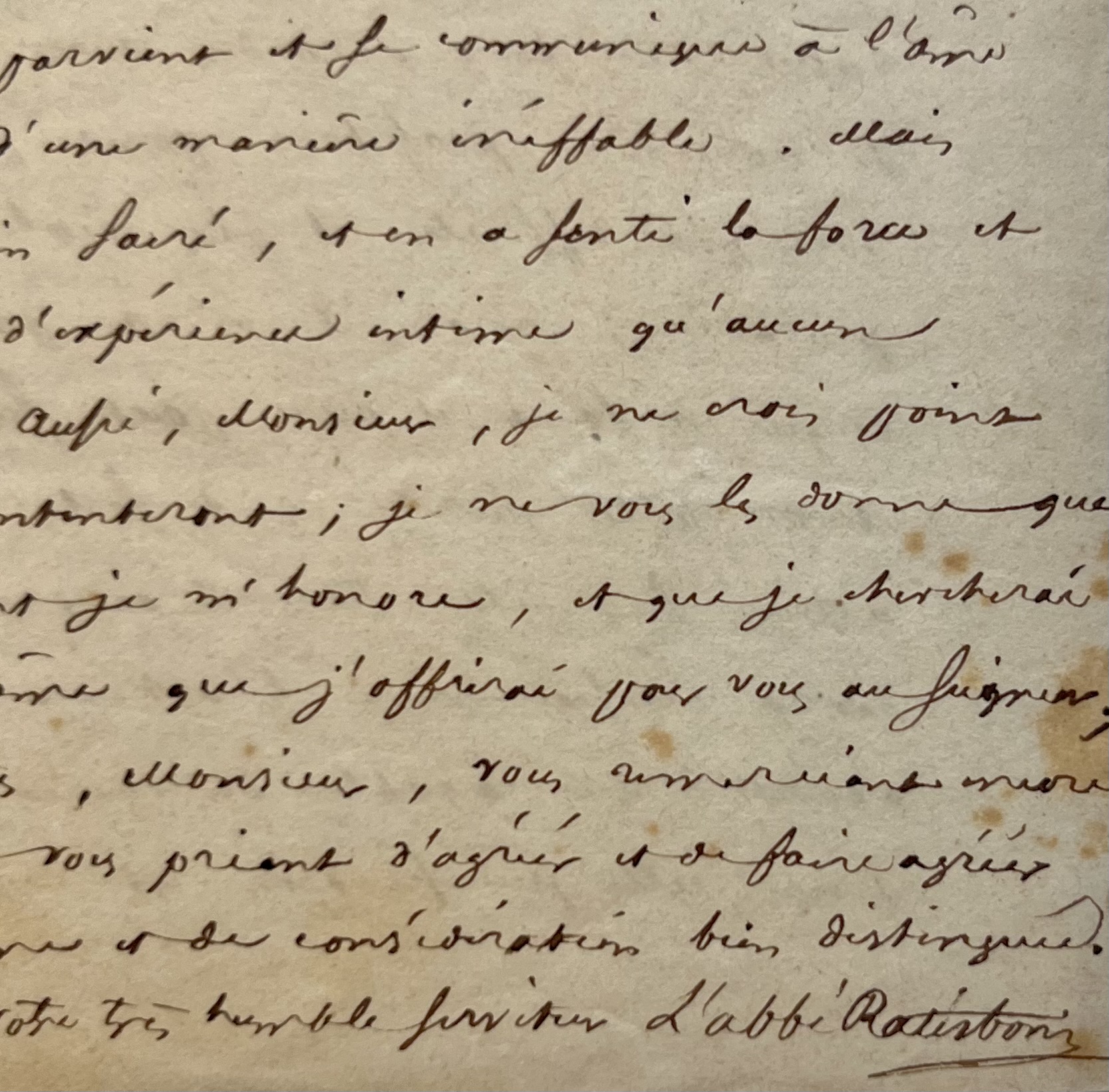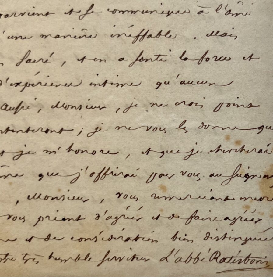 Dense et intéressante de Théodore Ratisbone, fondateur de la Congrégation de Notre-Dame de Sion, lettre adressée à un châtelain, dont il fut l'hôte, relative à la Révélation chrétienne, à l'organisation de l'Eglise Catholique et à l'éducation morale et spirituelle.